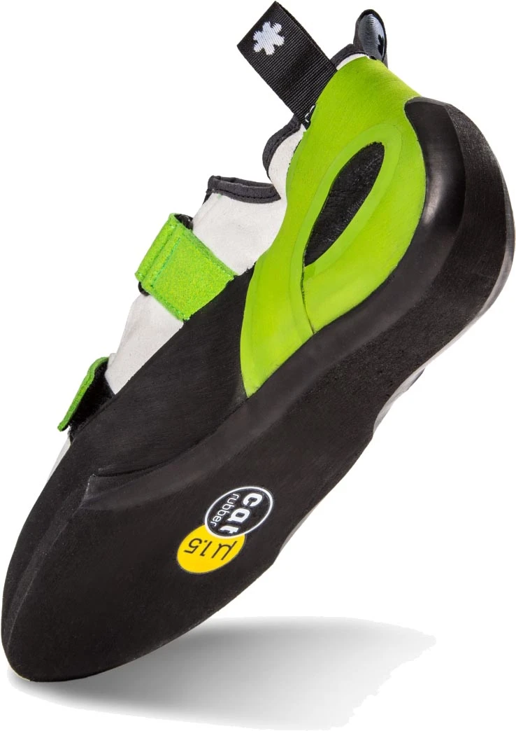 Díky lepičce CAT rubber 1,5 se hodí pro lezení na tření. Asymetrické suché zipy. Tvrdá mezistélka zlepšuje jejich vlastnosti na menších stupech, zejména lištách.