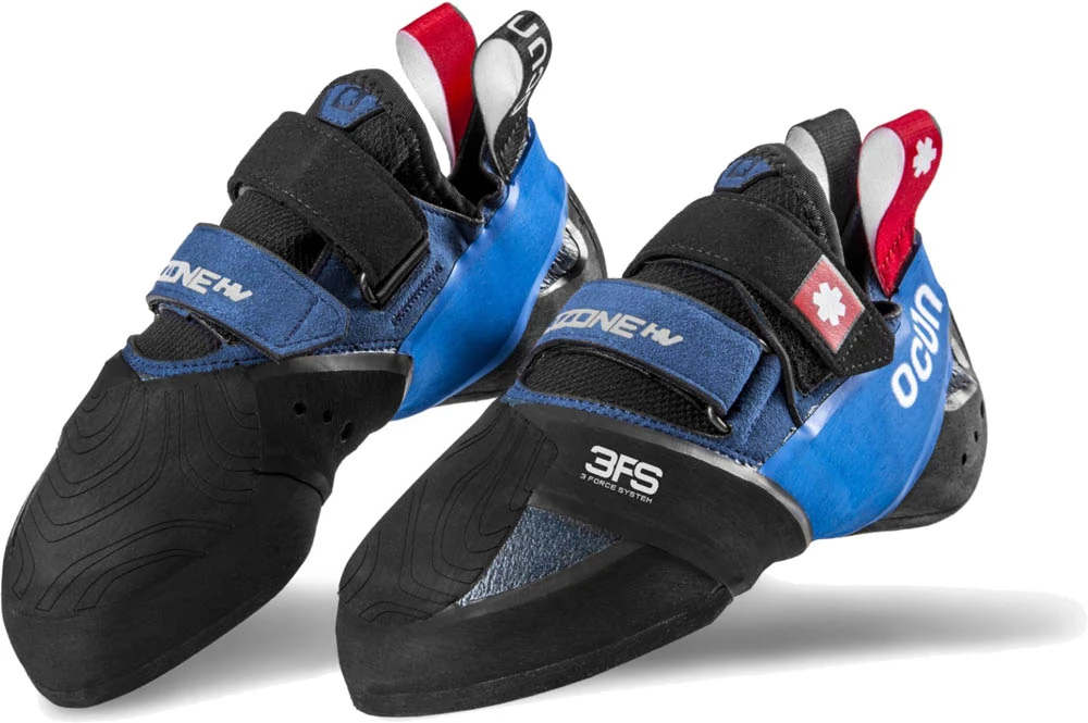 Ocún Ozone HV: jsou oblíbené lezečky s rozšířeným kopytem oproti standardnímu modelu. Zapínání na suché zipy. Pevné v torzi. Asymetrická konstrukce.