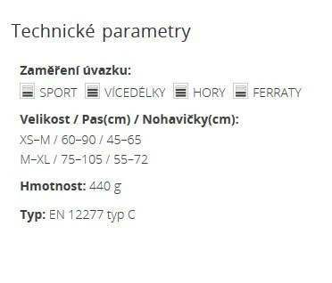 - Certifikace sedáku: EN 12277, CE, UIAA 105.