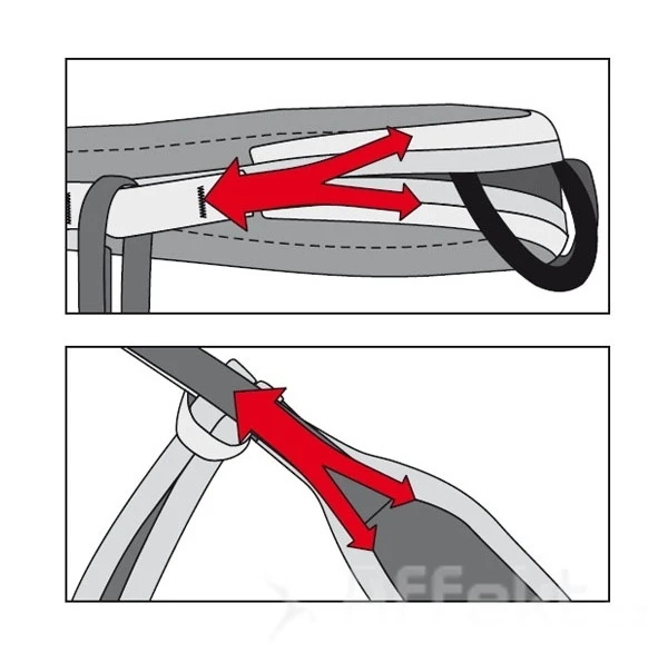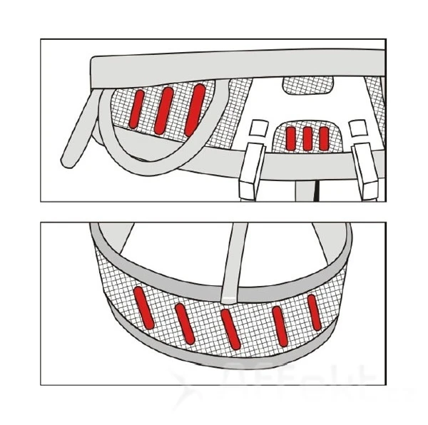 Disponuje rozšířeným pasem, ale konstrukce nevychází ze středového nosného popruhu. Místo toho má dvě nosné lemovky, které dobře rozkládají sílu pádu.Perforovaná pěna uvnitř sendvičů zajišťuje prodyšnost úvazku v teplých dnech. Na vnitřní straně pasu a nohaviček je použita umělá kůže na bázi mikrovlákna, která je příjemná na tělo. Sedák má 4 poutka na materiál