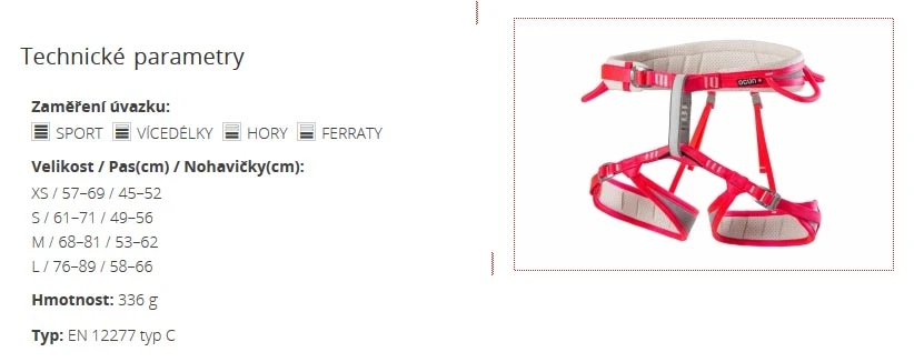Má rozšířený pas, kdy konstrukce vychází z dvou nosných lemovek, které dobře rozkládají sílu pádu.Perforovaná pěna uvnitř sendvičů zajišťuje prodyšnost úvazku v teplých dnech. Na vnitřní straně pasu a nohaviček je použita umělá kůže na bázi mikrovlákna, která je příjemná na tělo. Sedák má 4 poutka na materiál.