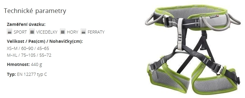 Disponuje mírně rozšířeným pasem pro měkké pády a má 5 poutek pro nacvaknutí všeho potřebného materiálu (expresek, friendů, vklíněnců). Systém posuvného pasu mu dává možnost dokonalého centrování polstru i velikostní flexibilitu.