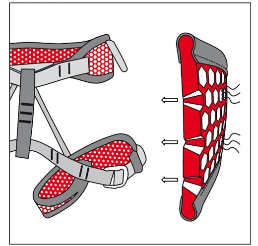 Sendvič pasu a nohaviček jsou z děrované 3D pěny – jednovrstvý materiál s vysokou prodyšností a tvarovou flexibilitou. Je odolný proti oděru a omyvatelný.