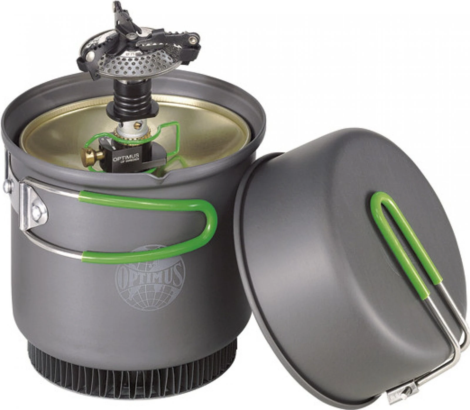 Optimus Crux & Terra Weekend – velice kompaktní vařič kombinovaný s ešusem o objemu 0,95 l, který obsahuje výměník tepla. Díky tomu uvaří cca o 30% úsporněji než klasický vařič. Nádoba díky lisovanému aretačnímu systému sedí pevně na vařiči, takže nehrozí žádné náhodné vylití.