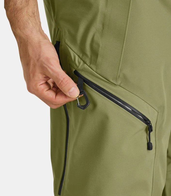 Mají vysoký pás, který dovnitř nepustí sníh ani v prašanu. Mají kapsu na lavinový vyhledávač i skiapas. Mají volný střih.