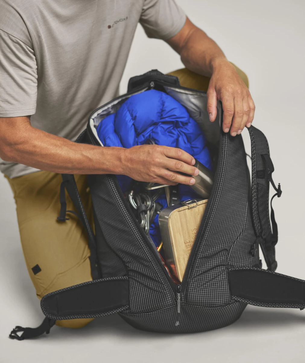 Zip na straně zad: Kromě klasického přístupu přes rolovací víko shora disponuje batoh zadním zipem, který umožňuje rychlý přístup k vybavení bez nutnosti vše vyndávat. Vnitřní uspořádání batohu je přehledné a praktické, takže máš své lezecké vybavení vždy po ruce. Více oddílů a kapes pomáhá udržet pořádek i během dlouhého lezeckého dne. To z něj dělá velmi praktické zavazadlo, kde k věcem na dně nemusíte "dolovat" přes celou nálož.