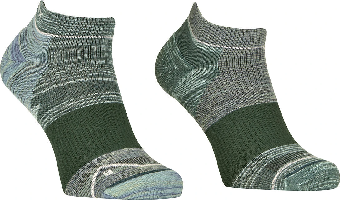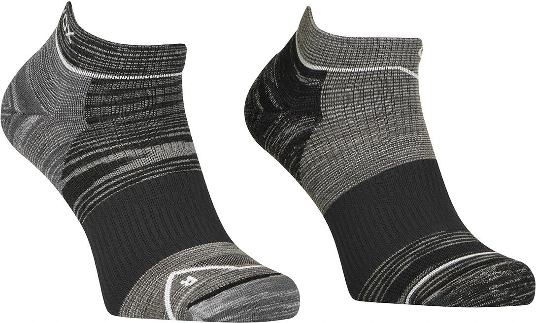 Ortovox Alpine Low Socks M: pánské funkční kotníkové ponožky pro náročné horské letní aktivity. Jsou vyrobené ze směsi Merino vlny a syntetiky. Vlna Merino pohlcuje vlhkost, hřeje i za mokra, má antibakteriální vlastnosti, absorbuje pachy. Polyamidové vlákna zvyšují odolnost i životnost ponožek. Ponožky mají ergonomický tvar, díky tomu nesjíždí. Vyztužená pata a špička, ploché švy chrání před tvorbou puchýřů.