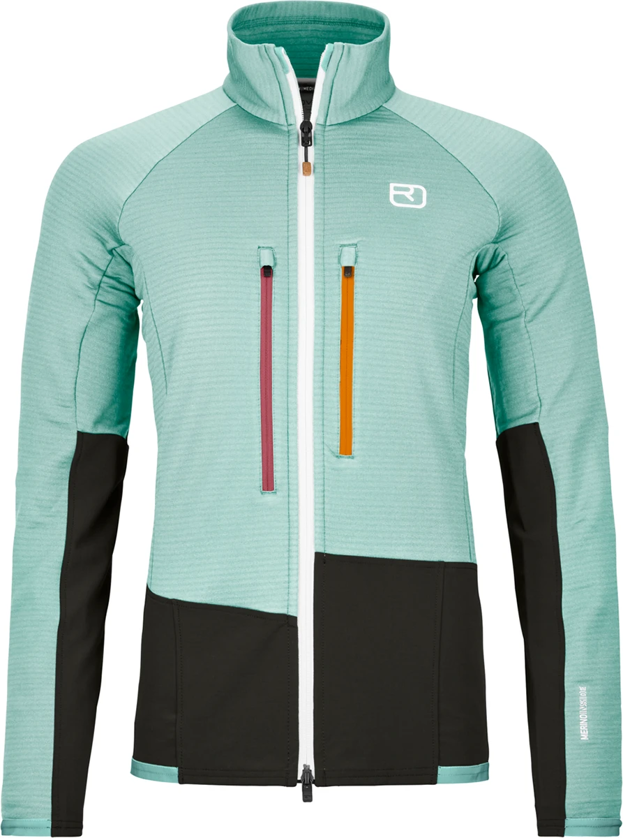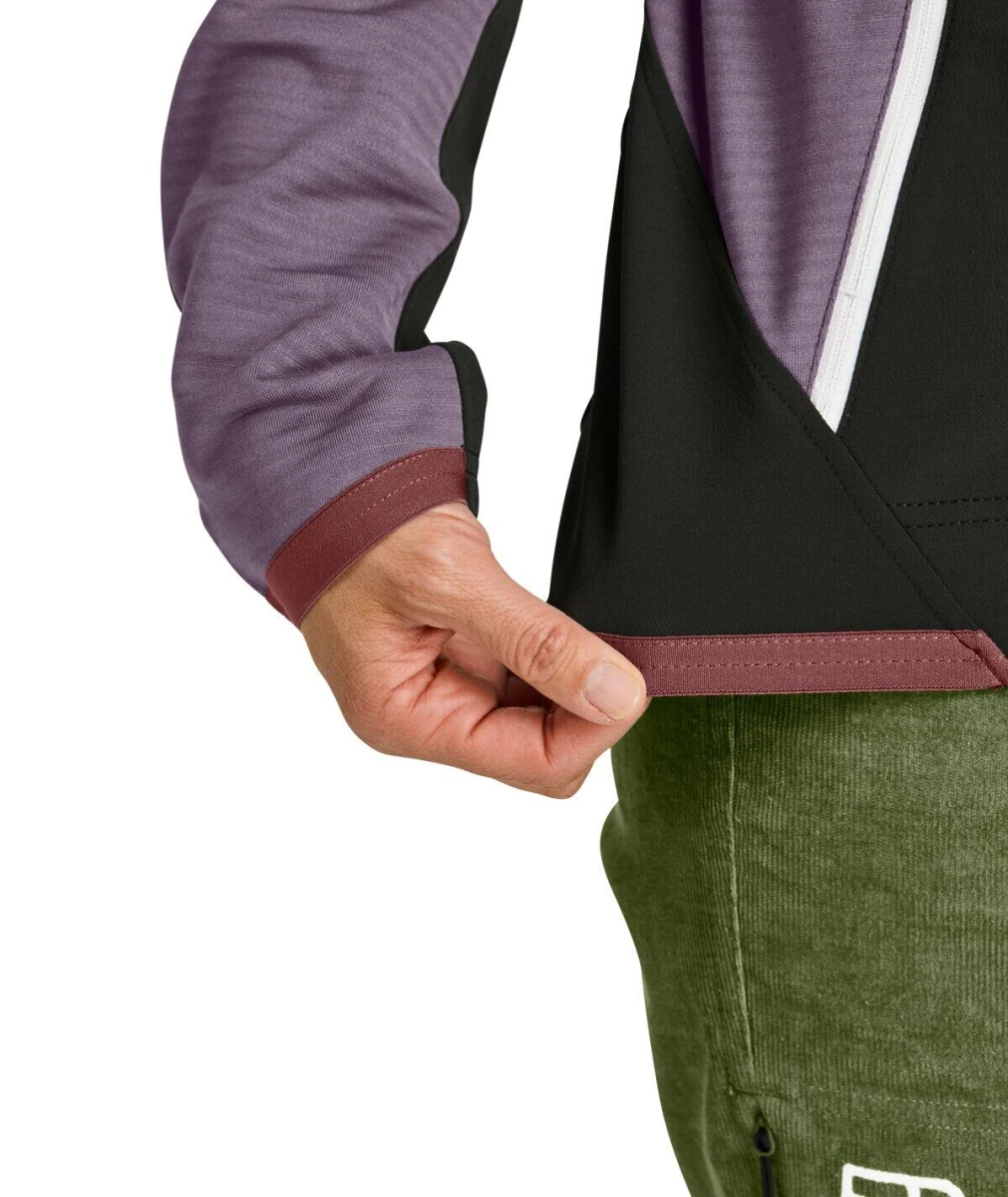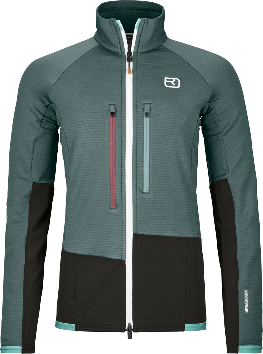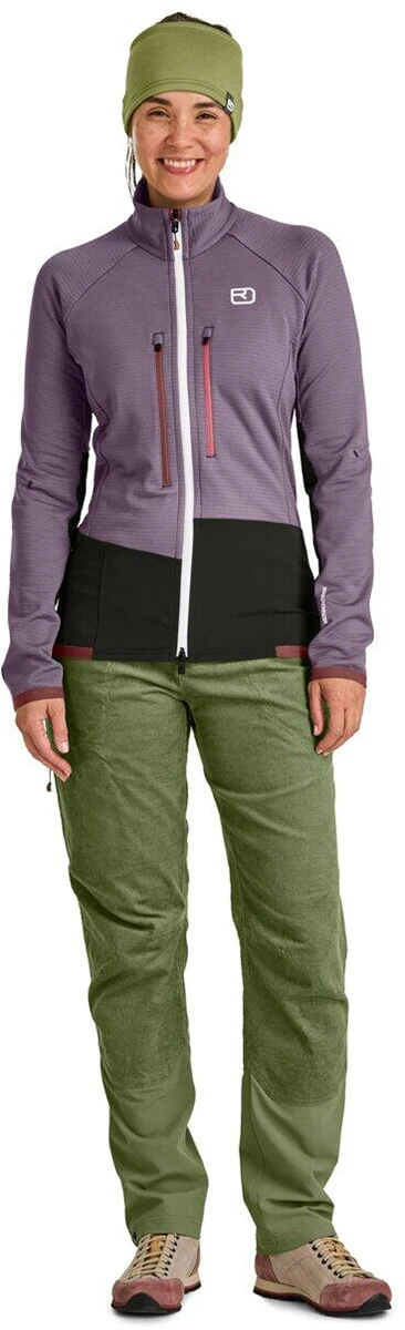 Ortovox Fleece Rib Jacket W: dámská mikina speciálně navržena pro horolezce. Tam kde je mikina při lezení nejvíc vystavena oděru od lezeckého úvazku, materiálu a skály (břicho, boky, spodek rukávů) je vyrobená z materiálu Merino Shield Tec, který je velmi odolný.