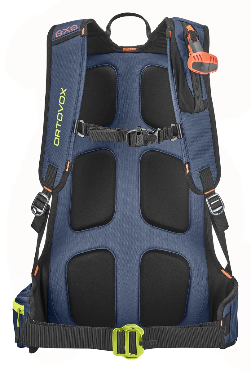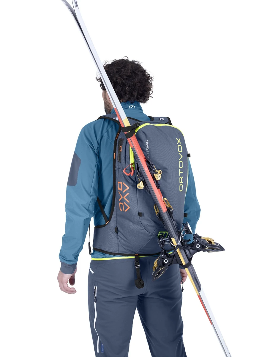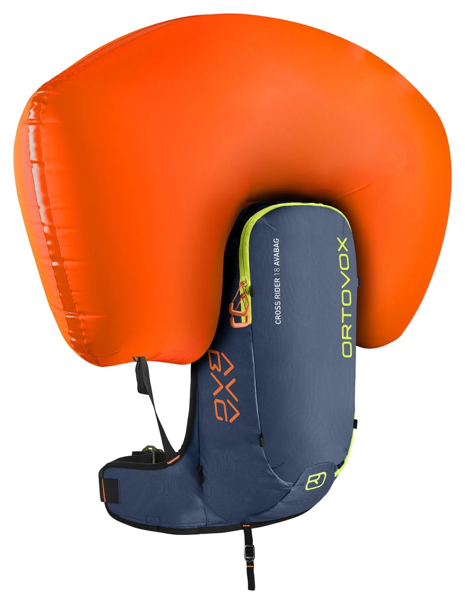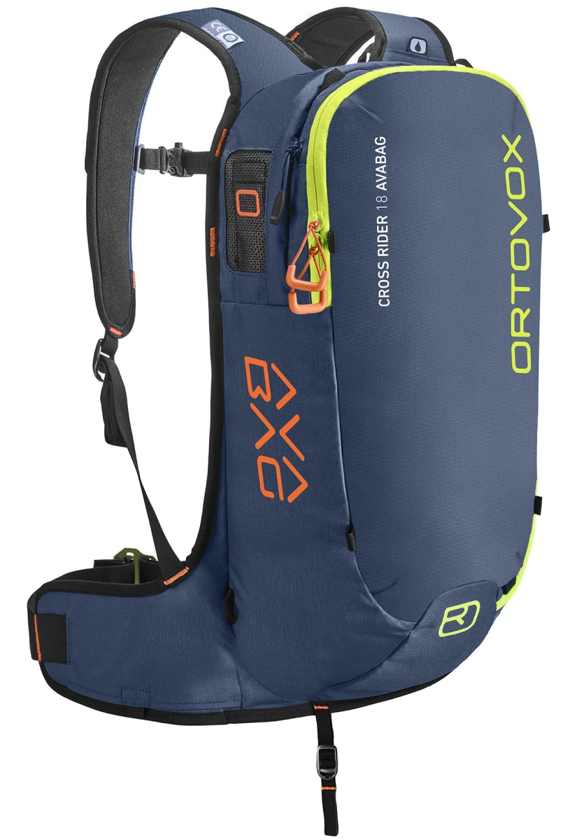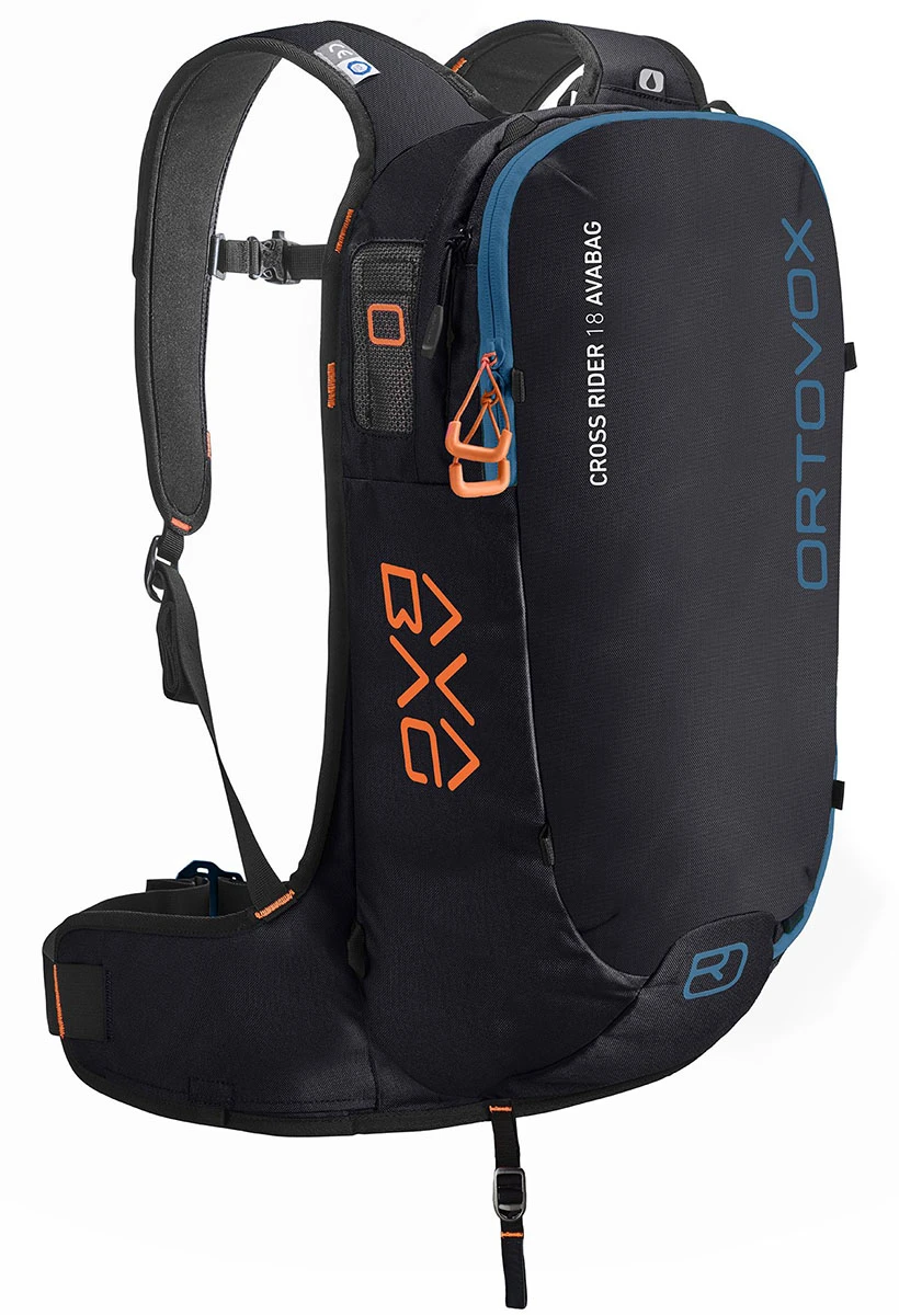 Ortovox Cross Rider 18 Avabag Kit: je velmi lehký freeridový batoh s airbagem o objemu 18 l. Má úžasnou váhu, jen 1630 g včetně Avabagu. Zádový systém je vyroben tak, aby v něm nezůstával sníh v případě pádu. Je polstrovaný.