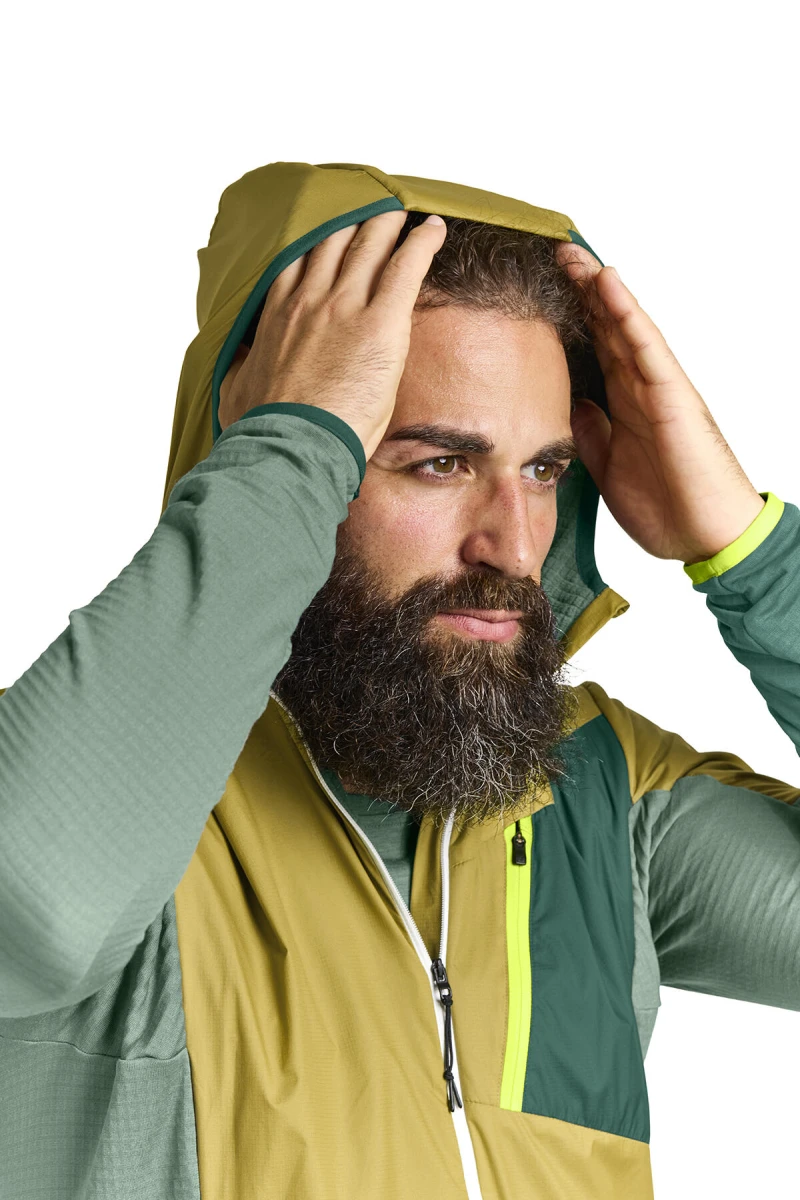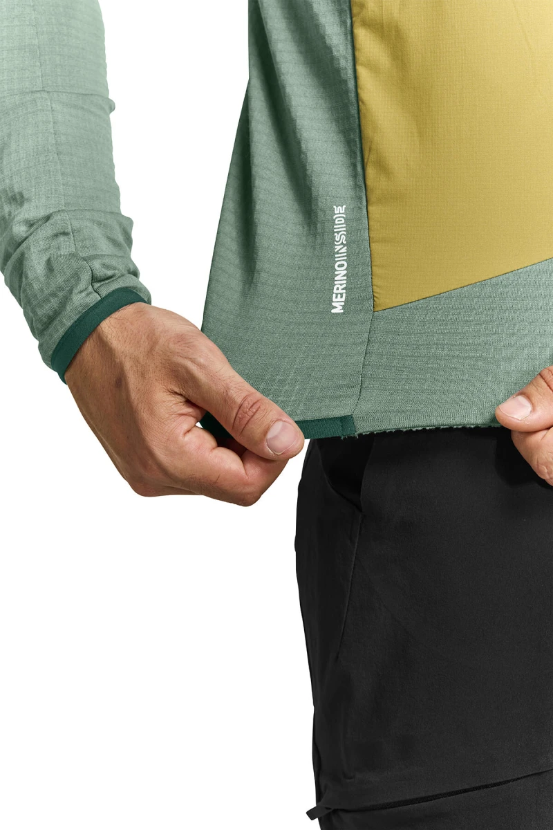 Na přední části, ramenou a kapuci je větruodolný materiál Tec-Stretch, který je pružný a optimálně kopíruje každý tvůj pohyb. Merino Fleece Light Grid s vaflovou strukturou na vnitřní straně poskytuje dostatek tepla.