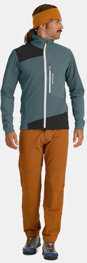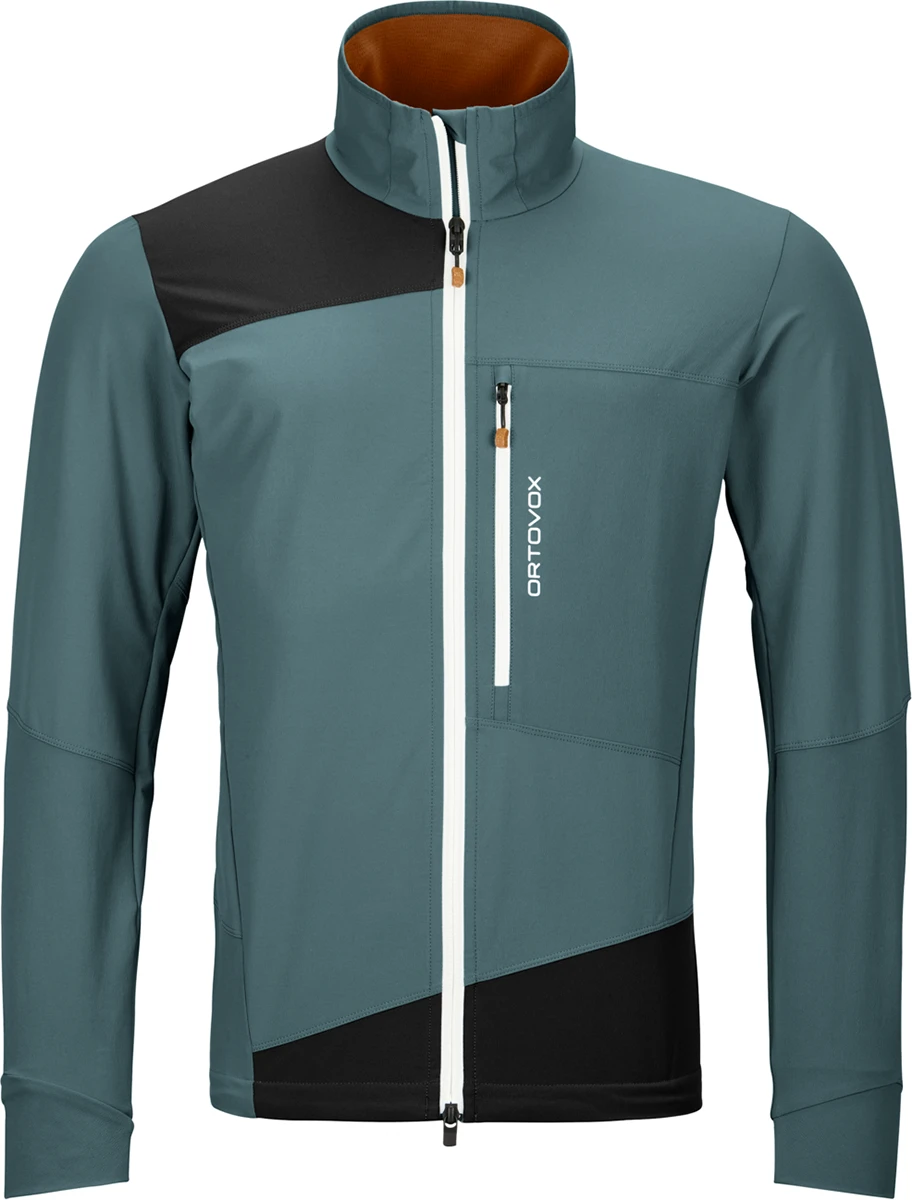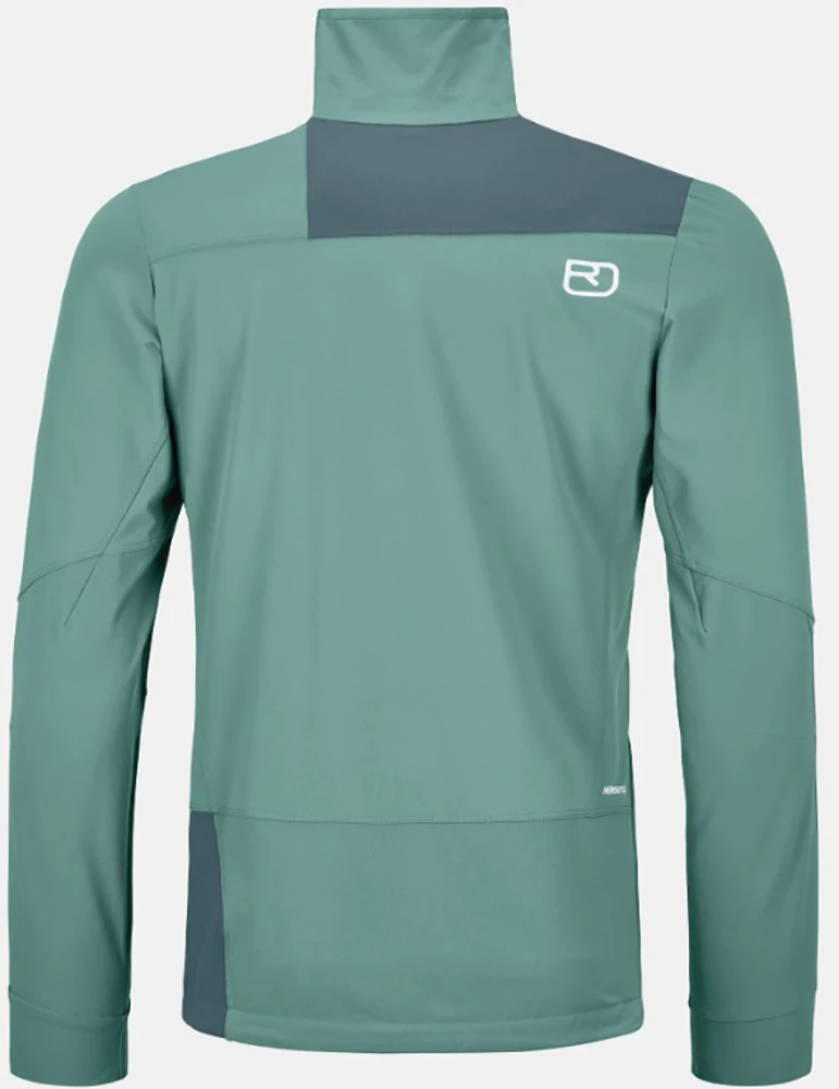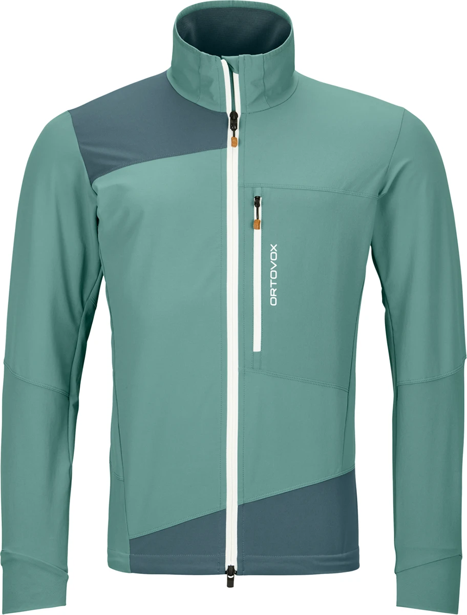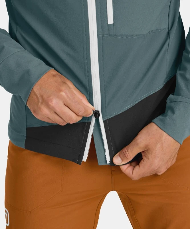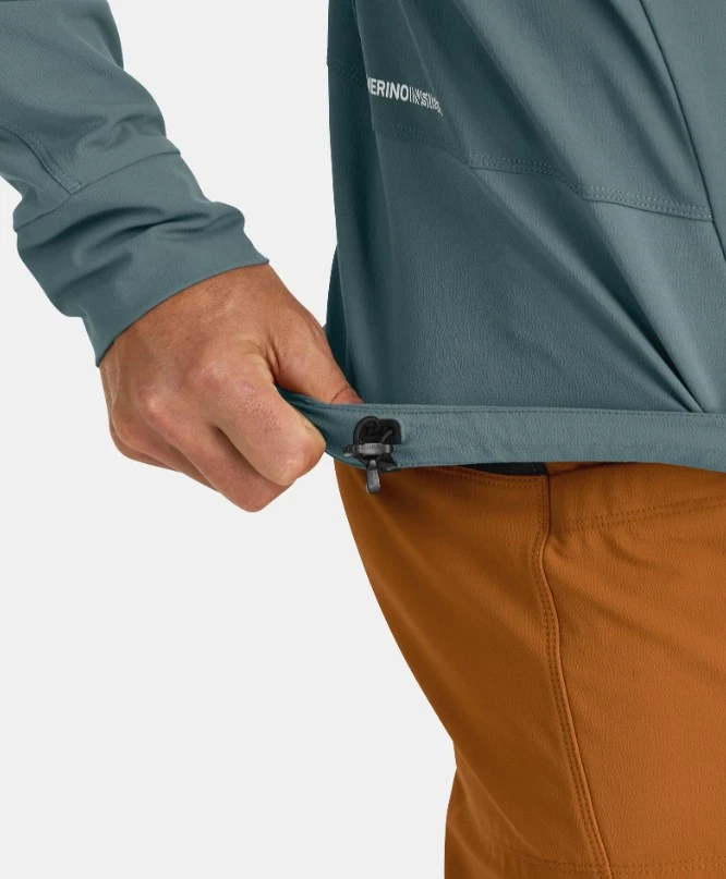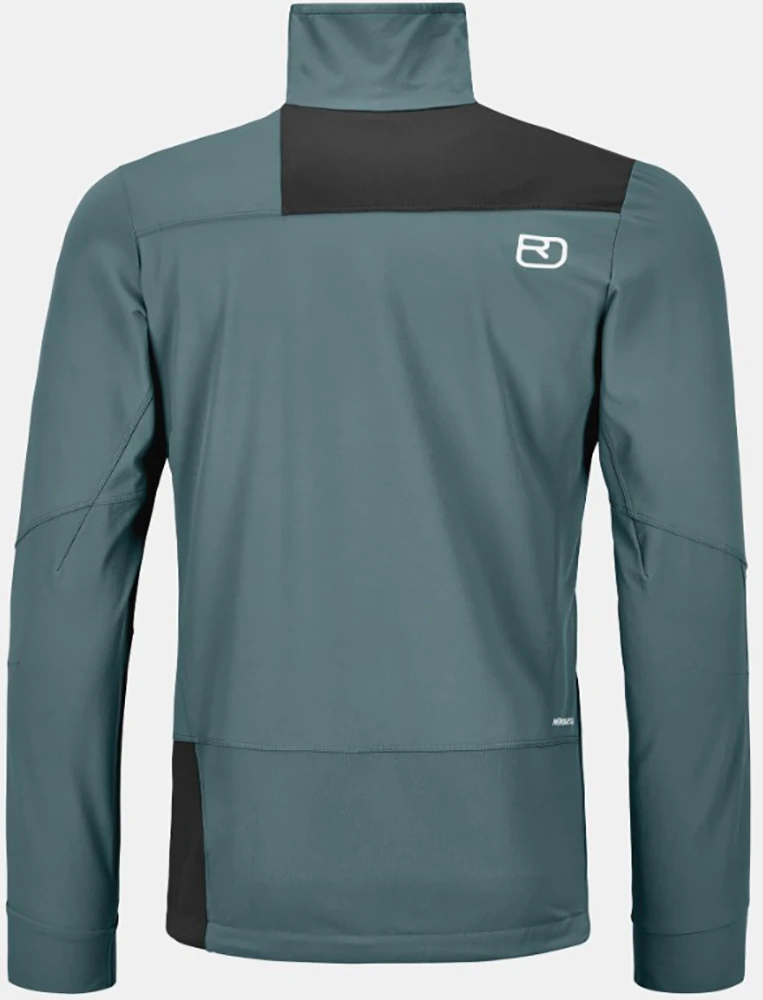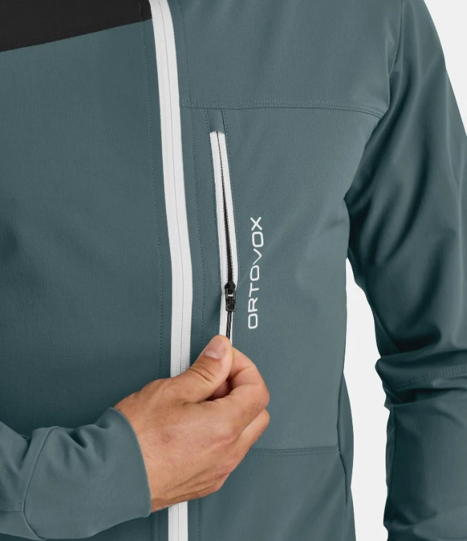 Merino vlna je použitá uvnitř, v límci a v pase. Pánská softshell bunda Ortovox pala Light Jkt má náprsní kapsu.