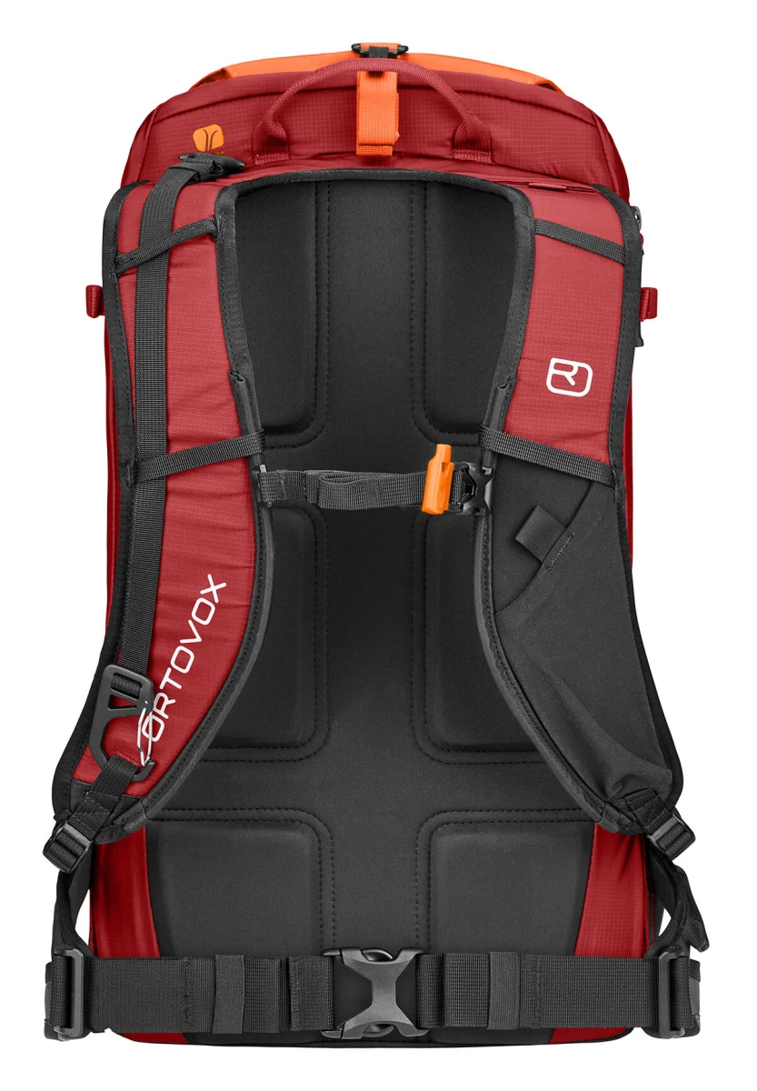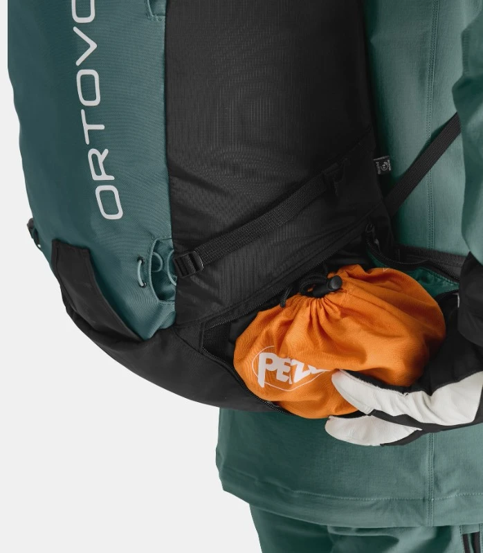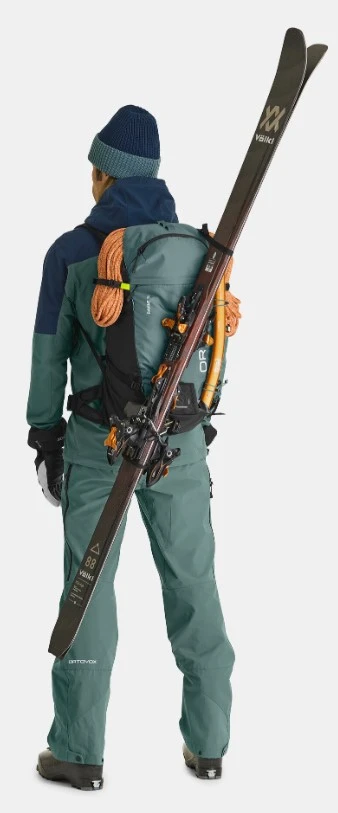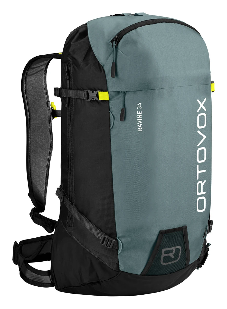 Ortovox Ravine 34: velmi lehký freeridový batoh o objemu 34 litrů. Má pohodlný zádový systém Full-Contact-Light, který rovnoměrně rozloží zátěž na záda a mezi bederní popruh a ramenní popruhy. Výhodou tohoto batohu je, že důležité položky vybavení lze uložit nebo vyzvednout bez sundání batohu. Lyže připevníte pomocí popruhu s karabinkou a na spodku batohu je snadno dostupná kapsa na mačky, stoupací pásy a další.