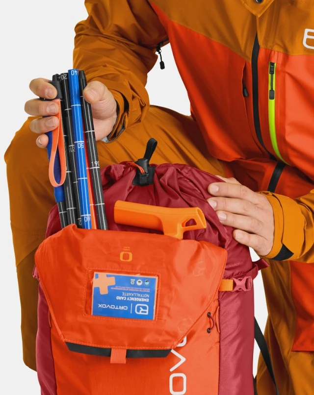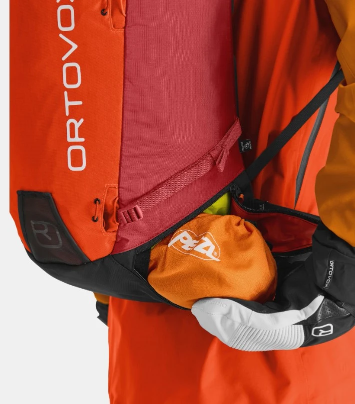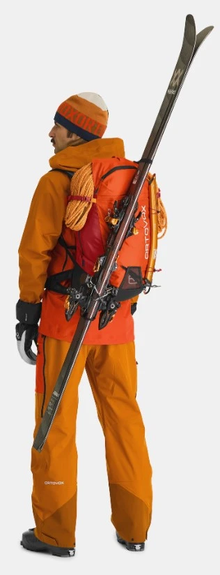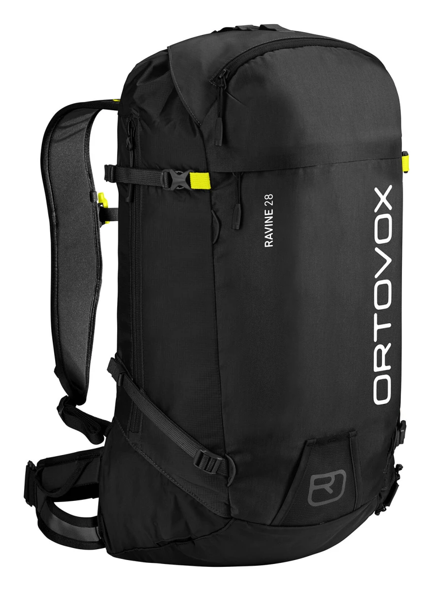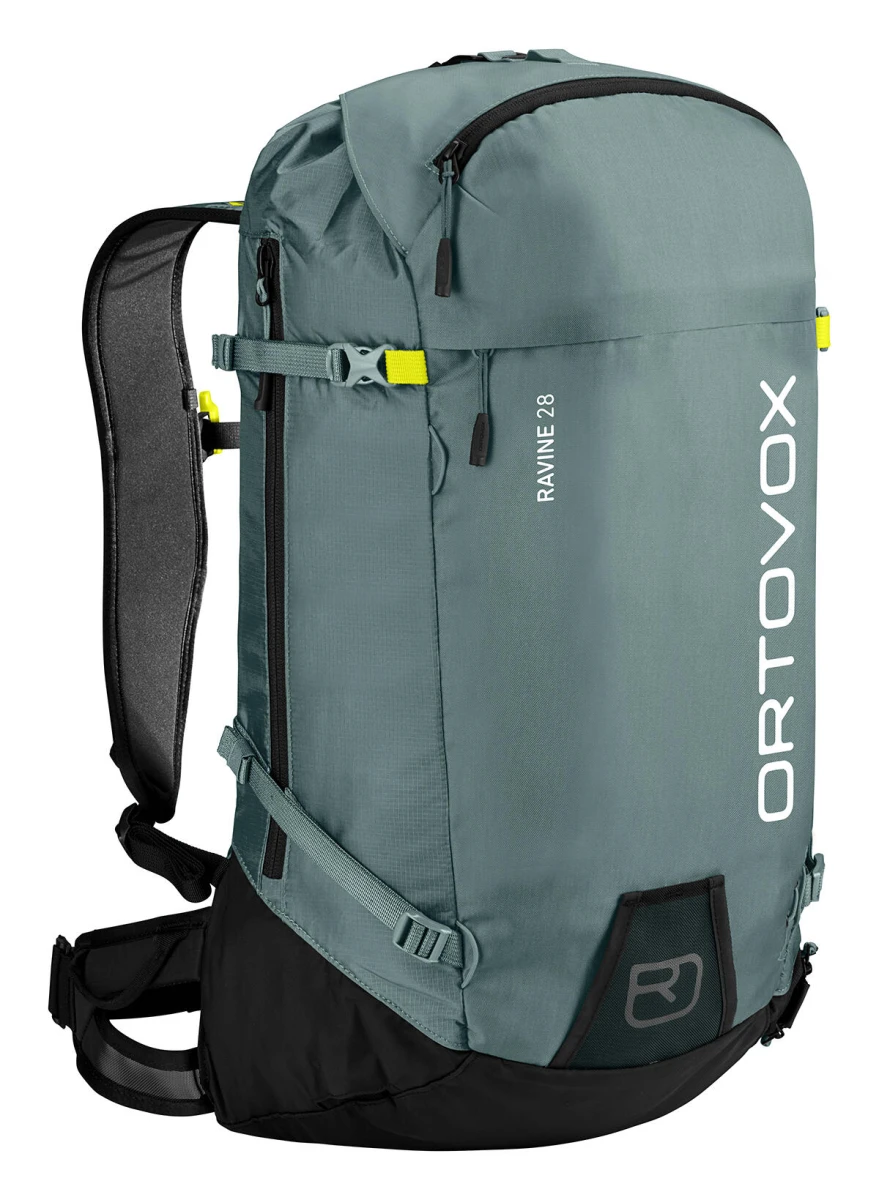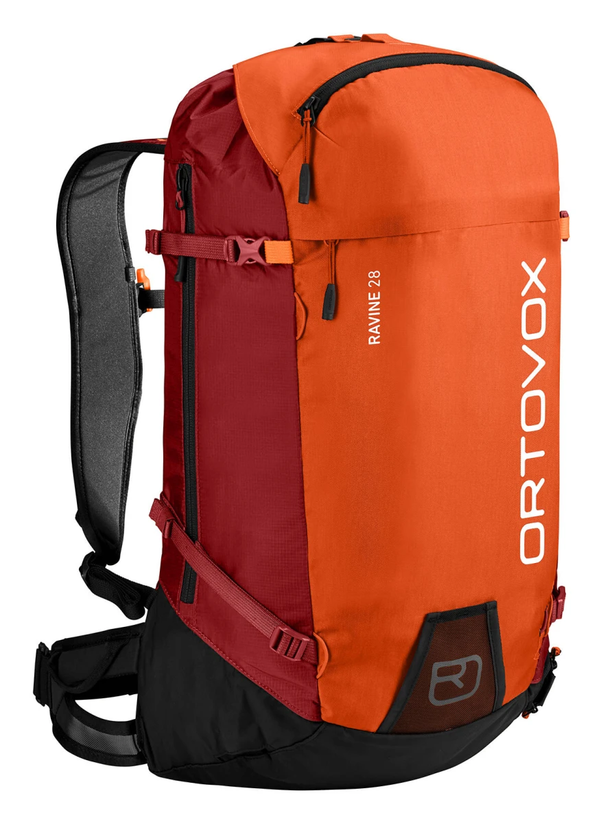 Ortovox Ravine 28: velmi lehký freeridový batoh o objemu 28 litrů. Má pohodlný zádový systém Full-Contact-Light, který rovnoměrně rozloží zátěž na záda a mezi bederní popruh a ramenní popruhy. Výhodou tohoto batohu je, že důležité položky vybavení lze uložit nebo vyzvednout bez sundání batohu. Lyže připevníte pomocí popruhu s karabinkou a na spodku batohu je snadno dostupná kapsa na mačky, stoupací pásy a další.