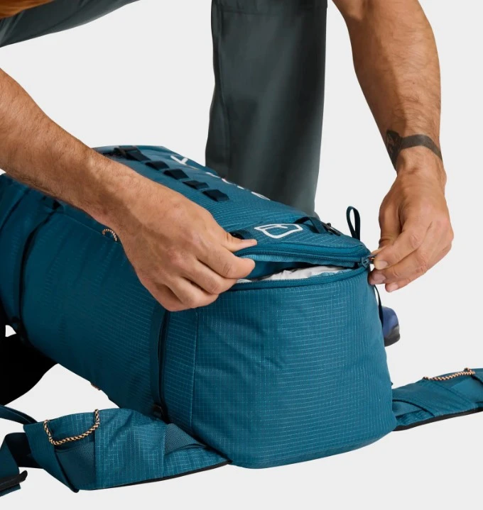 Obvodový zip: Kromě klasického horního vstupu nabízí Trad 35 velkorysý přední obvodový zip. Ten vám umožní otevřít batoh "jako kufr", takže se okamžitě dostanete k věcem uloženým uprostřed nebo na dně, aniž byste museli vybalovat lano a další materiál uložený nahoře.