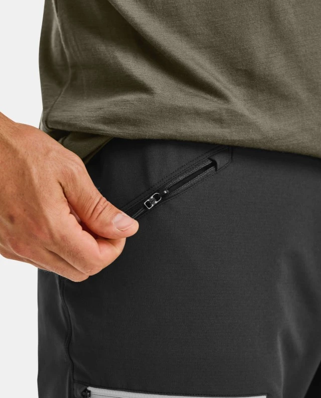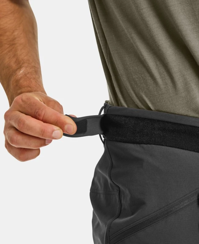 Kalhoty mají dvě boční kapsy a jednu na stehně, nastavitelný pásek, háček na tkaničky, který drží kalhoty na botě a brání tak zalézání sněhu či kamínků pod ně.