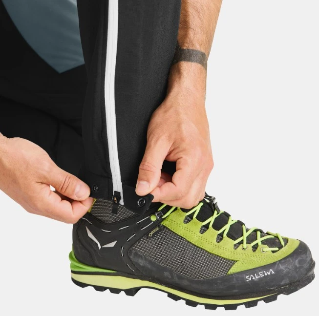 Nohavice mají udělané tak, aby nebyly nutné návleky a kalhoty se daly zafixovat dyneemovými pásky pod botou. Materiál je pružný.
