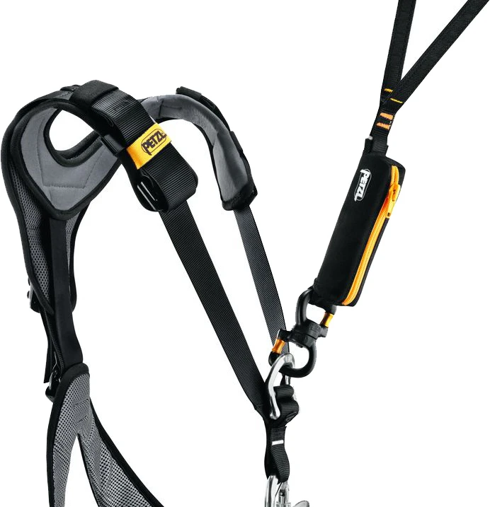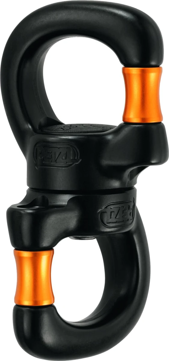 Otočný závěs Petzl Swivel Open – s kuličkovým ložiskem. Zabraňuje kroucení lana nebo jiných pracovních pomůcek. Jeho výhodou je, že pro připojení na sedák nebo další pomůcky není potřeba dalších karabin. Ušetříte tak na objemu i váze.