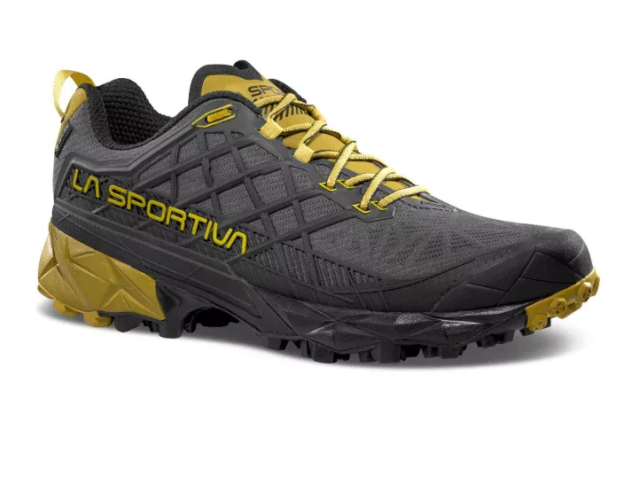 La Sportiva Akyra II GTX Men – pánské trailové boty s goretexem určené na trailové běhy, horské běhy a středně dlouhé tratě. Bytelný svršek, podrážka s drapáky do terénu, masivní tlumení došpalu IBS systémem. Goretexová membrána chrání vaše nohy pře mokrem, proto se La Sportiva Akyra GTX hodí pro zimní výběhy nebo pro nejisté počasí.