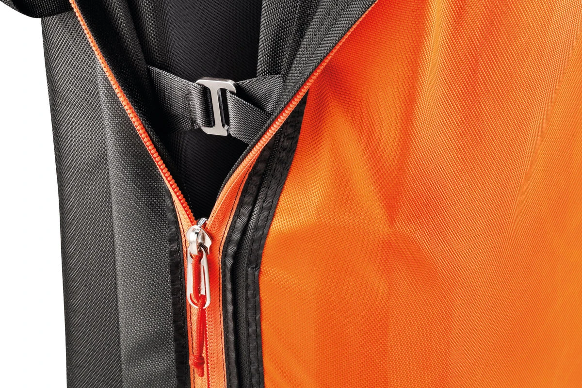 Taco systém sbalení pomocí klopy na zip, která při rozbalení kryje zádovou konstrukci ramenních popruhů.