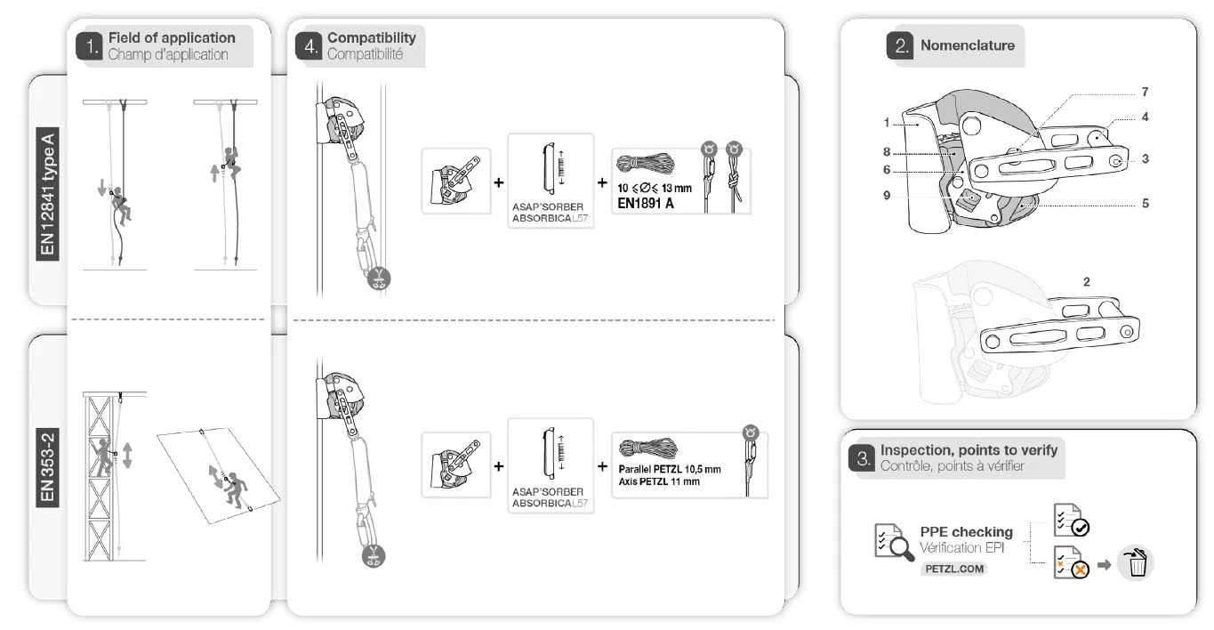 – CE EN 353 2 (systém zachycení pádu): použití zachycovače ASAP s nízkoprůtažným lanem EN 1891 typ A, které je certifikováno pro tento produkt (průměr 10.5 až 13 mm se zašitým zakončením).