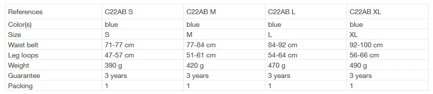 Je lehký a pohodlný s dobře polstrovánými nožními popruhy a pásem, nebude vám vadit v něm sedět delší dobu na štandech. Má dostatek poutek na materiál + možnost použít caritooly například na ledovcové šrouby. Nastavitelné přezky DoubleBack. Možnost připnout 3 nosiče materiálu CariTool.