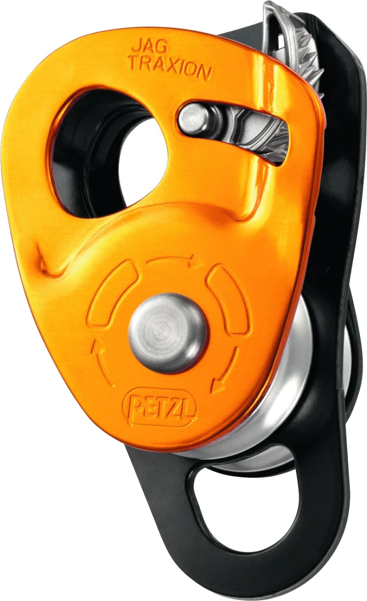 Petzl Jag Traxion: dvojitá kladka s blokantem speciálně konstruovaná pro vytahování těžkých břemen. Umožňuje sestavení kladkostroje 4:1. Hliníkový kotouč o průměru 25 mm usazený v zapouzdřených kuličkových ložiscích. Vysoká účinnost: 91%.