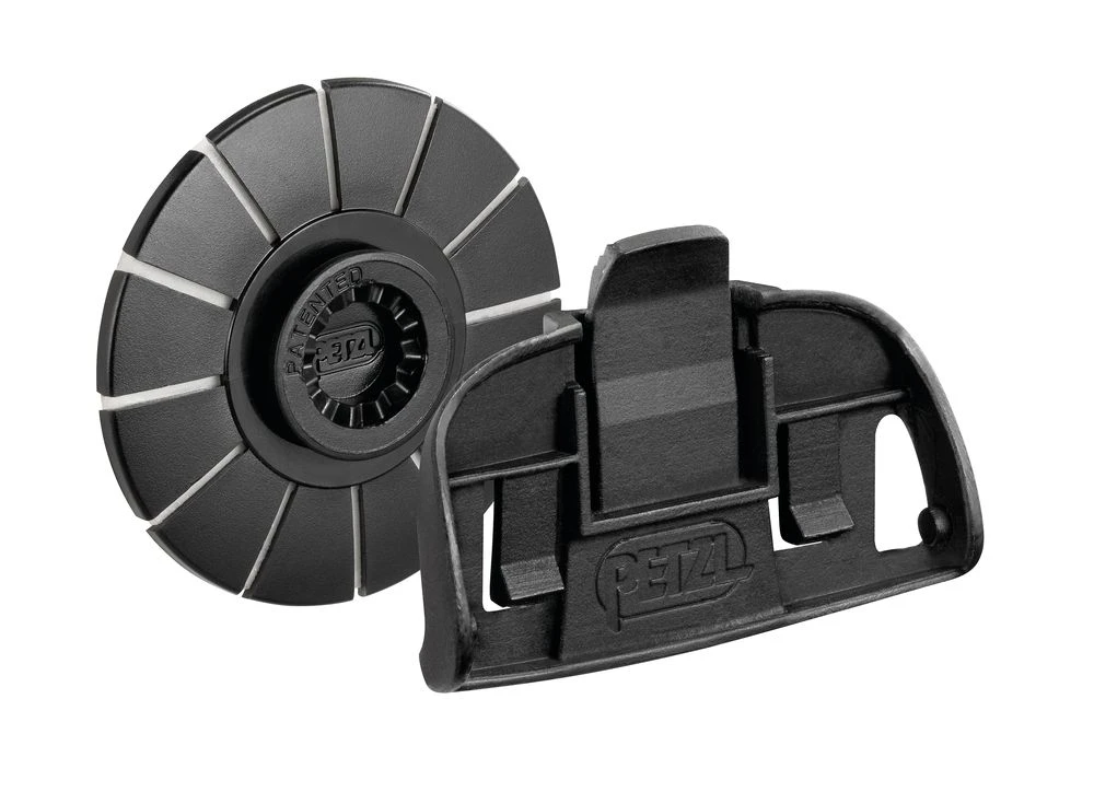 Petzl Kit adapt: slouží pro upevnění čelovek Petzl na přilbu. Terčík-úchytka se přilepí na přilbu a pak se do něj nasouvá čelovka.