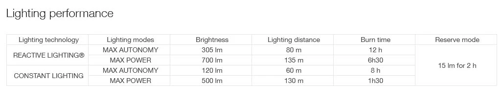 Doba svícení: reaktivní svit 6,5 (max)/15 (ekonomy) h normální 1,5 (max)/8 (ekonomy) h