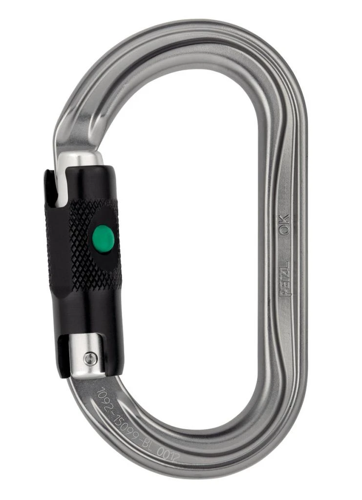 Petzl OK Ball-Lock: je duralová karabina oválného tvaru s automatickým třípolohovým zámkem typu ball lock (musíte zmáčknout kuličku až teprve potom otočíte pojistkou. Je vhodná pro výškové práce, kde oválný tvar oceníte především. Je zajímavá tím, že se níkde nezadrhává, máte dostatek pracovního prostoru na obou koncích.