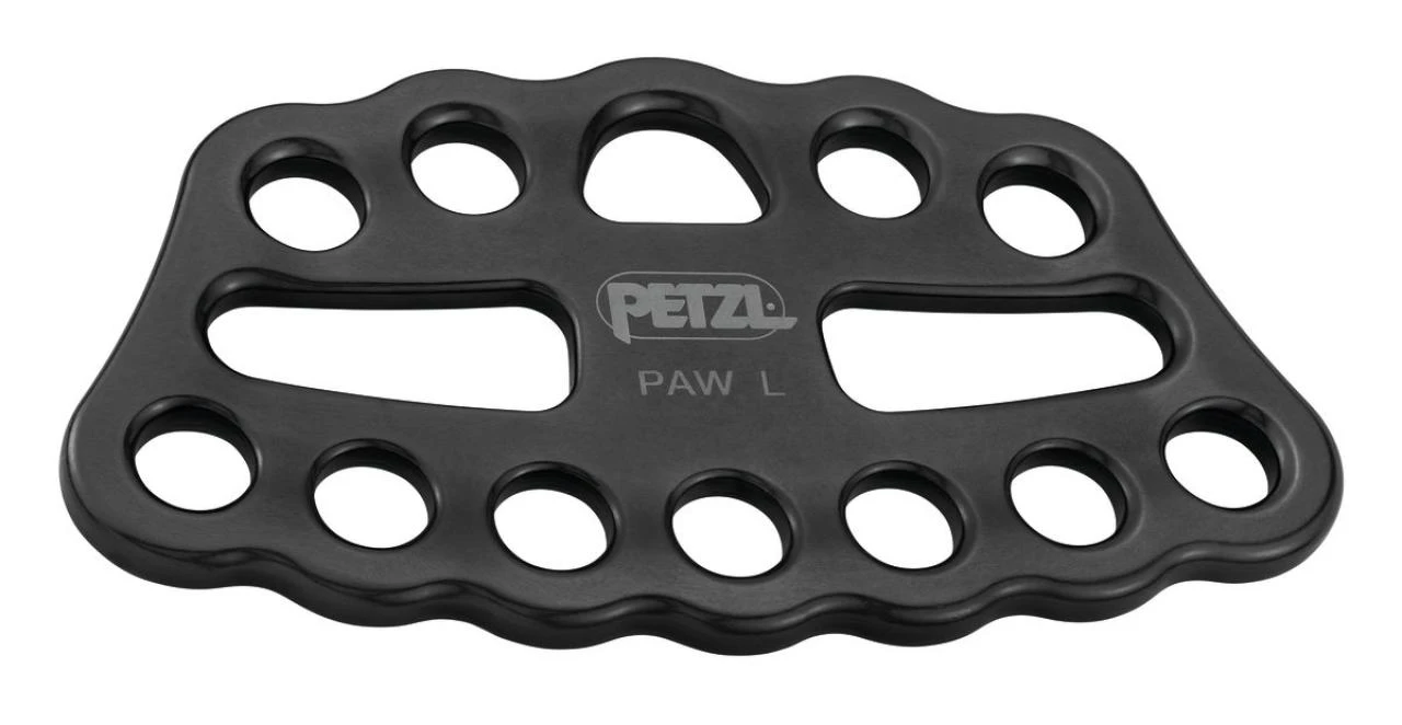 Deska na kotvení Petzl Paw L: slouží k uspořádání karabin a k optimálnímu rozkladu sil v kotvícím bodě. Je možné navázat lano přímo na kotvící desku.