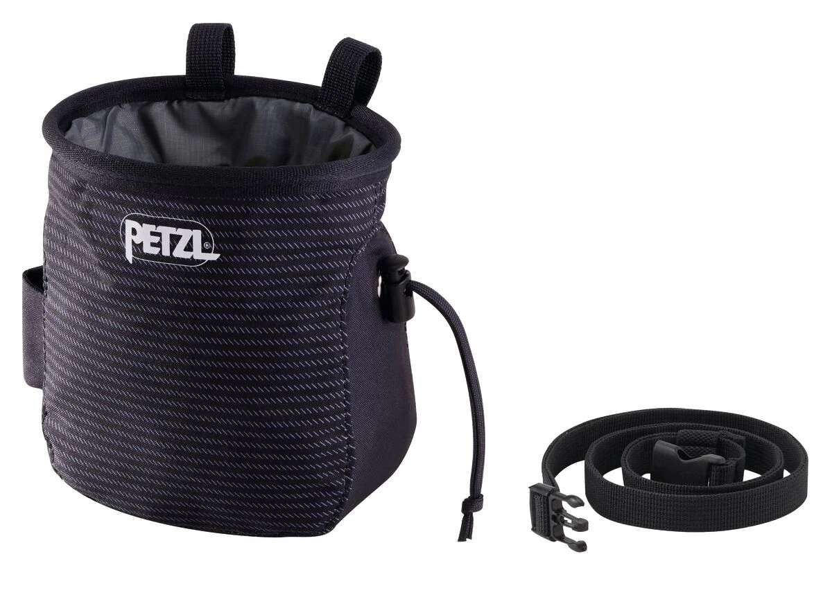 Pytlík na magnezium Petzl Saka: uzavírá se svorkou s píšťalkou na provázku. Vnitřní materiál je příjemný na dotek. Opasek je součástí dodání.