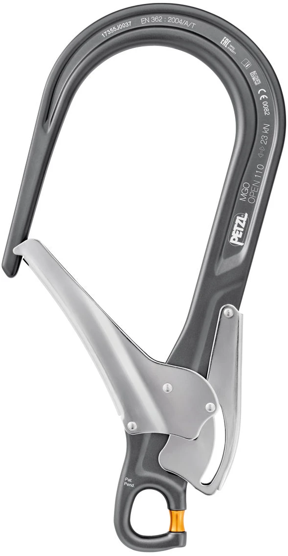 Směrová spojka Petzl MGO 110: velká s automatickou pojistkou zámku. Je vyrobená z oceli, světlost západky je 110 mm. Slouží k připojení na kovové konstrukce, ocelová lana a nosníky s velkým průměrem.