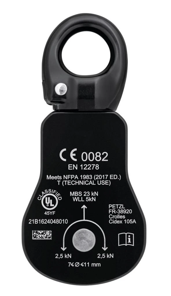 Tato kladka má zapouzdřené kuličkové ložisko, to jí dává vynikající účinnost. Otočný čep usnadňuje manipulaci, umožňuje orientaci řemenice pod zatížením a přímé připojení karabin, lan nebo smyček.