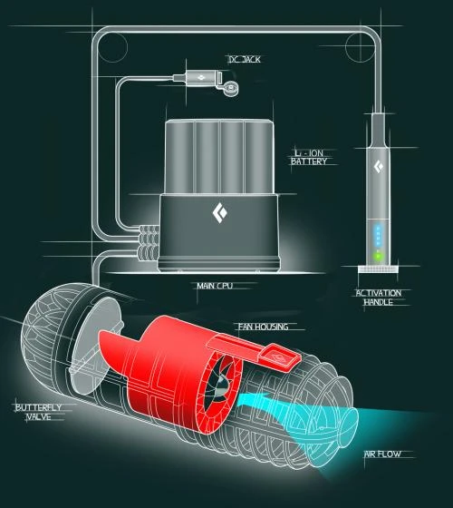Unikátní systém lavinových batohů Pieps spočívá v nafukování vaku. Má ventilátor na baterie, který do vaku vhání vzduch (170 litrů za 3 s). Proto jde nafouknout opakovaně a i zkušebně.