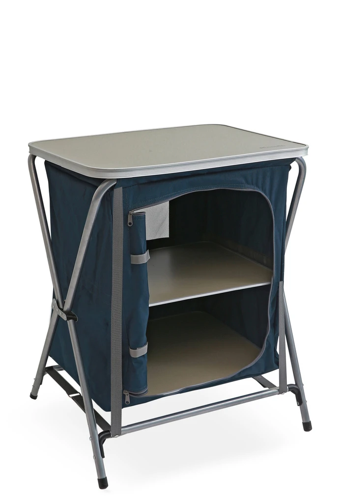 Úložná skládací skříňka Pinguin Kitchen S – praktická cestovní plátěná skříňka ideální pro dlouhodobé kempování. Obsahuje dvě vnitřní police pro uložení nádobí nebo trvanlivých potravin a na vrchní straně poskytuje pracovní/odkládací prostor. Dvířka na zip lze po otevření uchytit páskami se suchým zipem. Část zadní stěny je ze síťoviny, dovnitř tak proniká denní světlo pro usnadnění orientace.