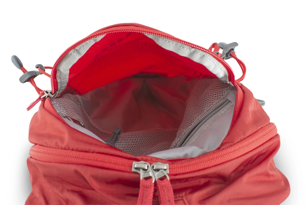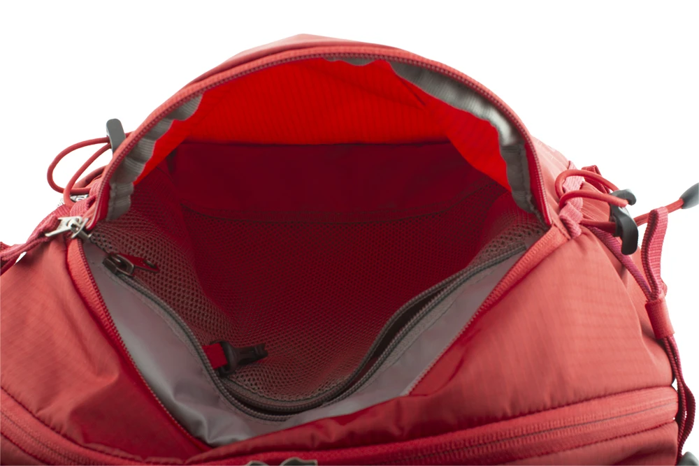 Pro zádový systém je použita pevná a tvarově stálá síťovina, která umožňuje výborné odvětrání zad. Vnitřní zádová kapsa, vnější zipová kapsa, pavouk v horní části batohu pro zavěšení přilby, reflexní poutko na blikačku, boční síťované kapsy.