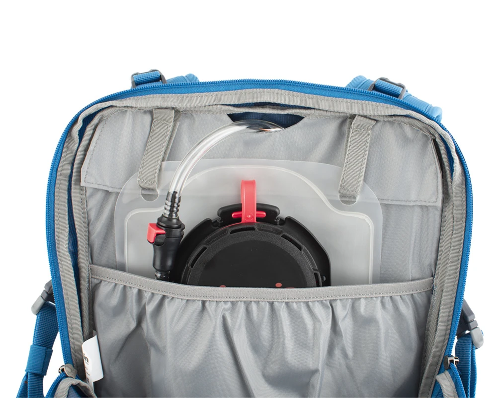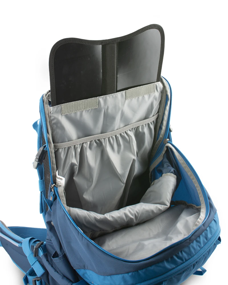 Přední kapsa je určena pro lavinovou sondu, lopatu. Možnost upnutí lyží, snowbardu, cepínů. Zádový systém je vyztužený polypropylenovou deskou s vyjímatelnou profilovanou duralovou výztuží.
