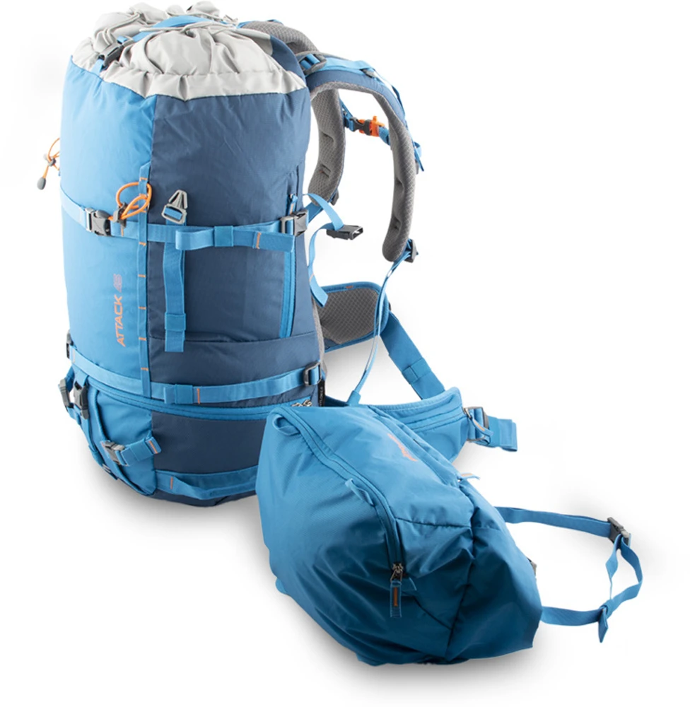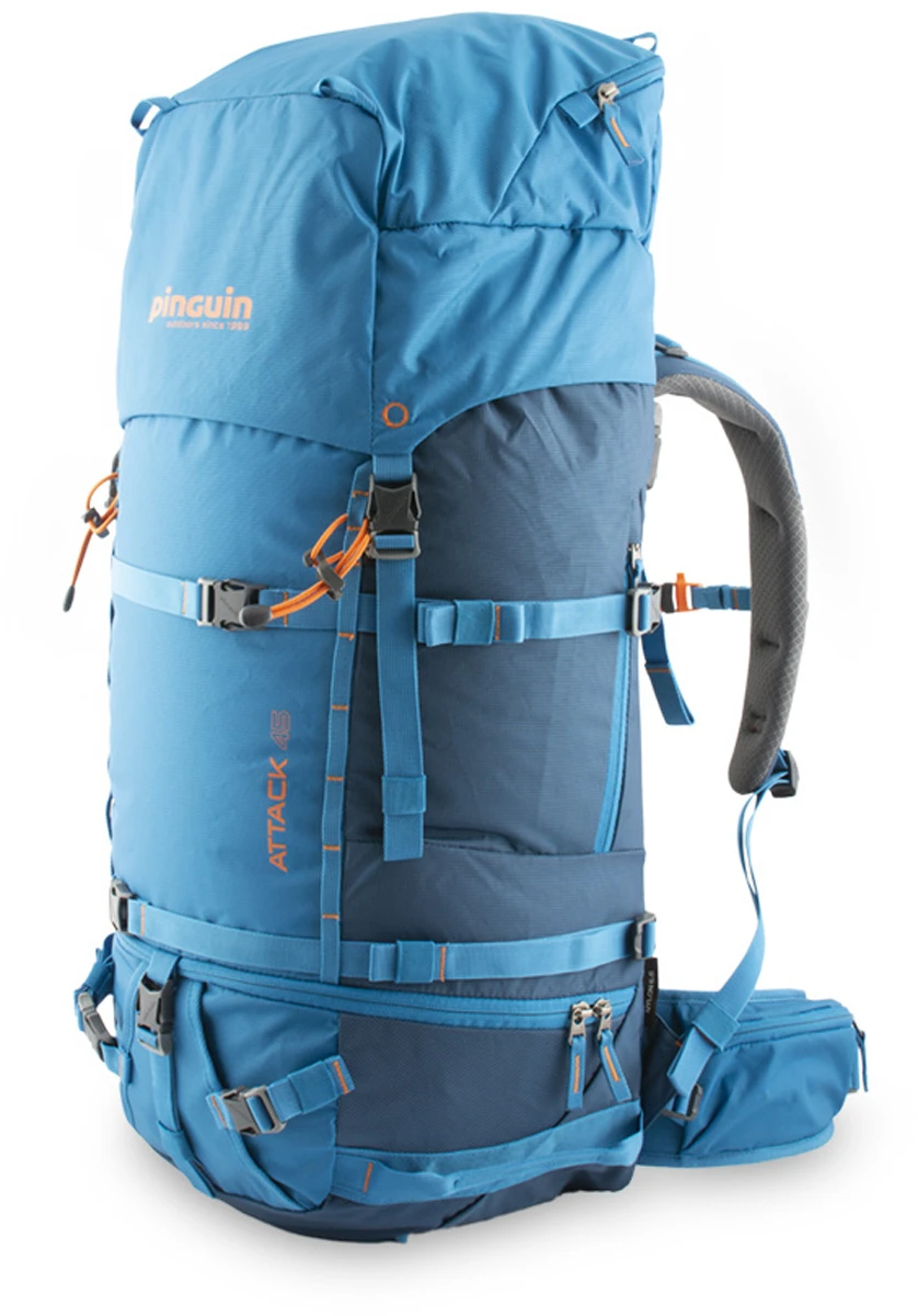 Alpinistický batoh Pinguin Attack 45 - dvoukomorový batoh určený pro lyžování, skialpinismus a VHT. Batoh Pinguin Attack 45 má anatomicky tvarované nosné popruhy a  zádový systém s polštářky pro efektivní odvětrání zad. Má poutka na cepíny, lyže a mačky.