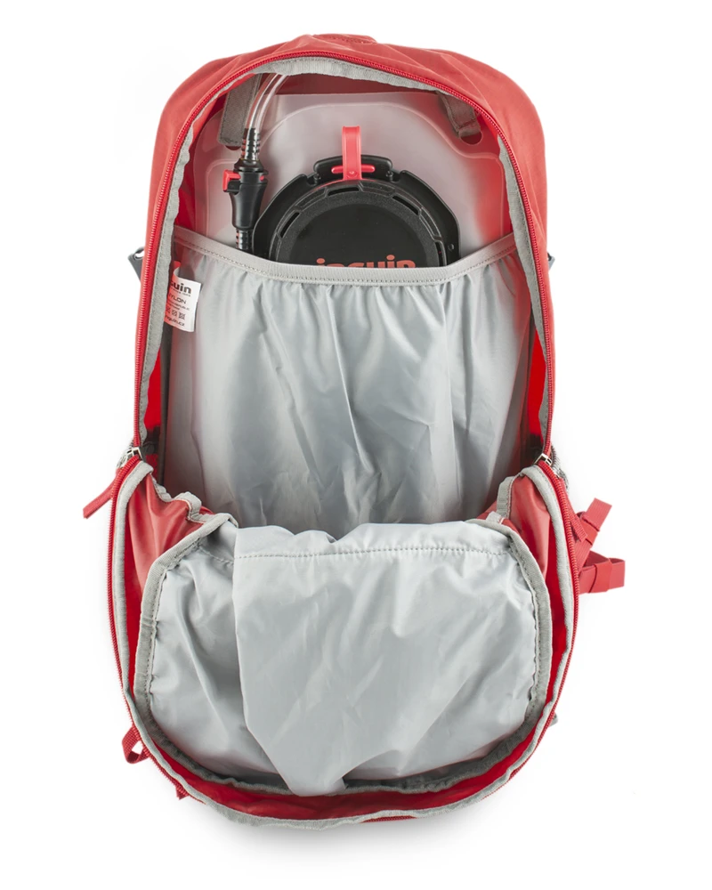 Pro zádový systém je použita pevná a tvarově stálá síťovina, která umožňuje výborné odvětrání zad. Vnitřní zádová kapsa, vnější zipová kapsa, pavouk v horní části batohu pro zavěšení přilby, reflexní poutko na blikačku, boční síťované kapsy.