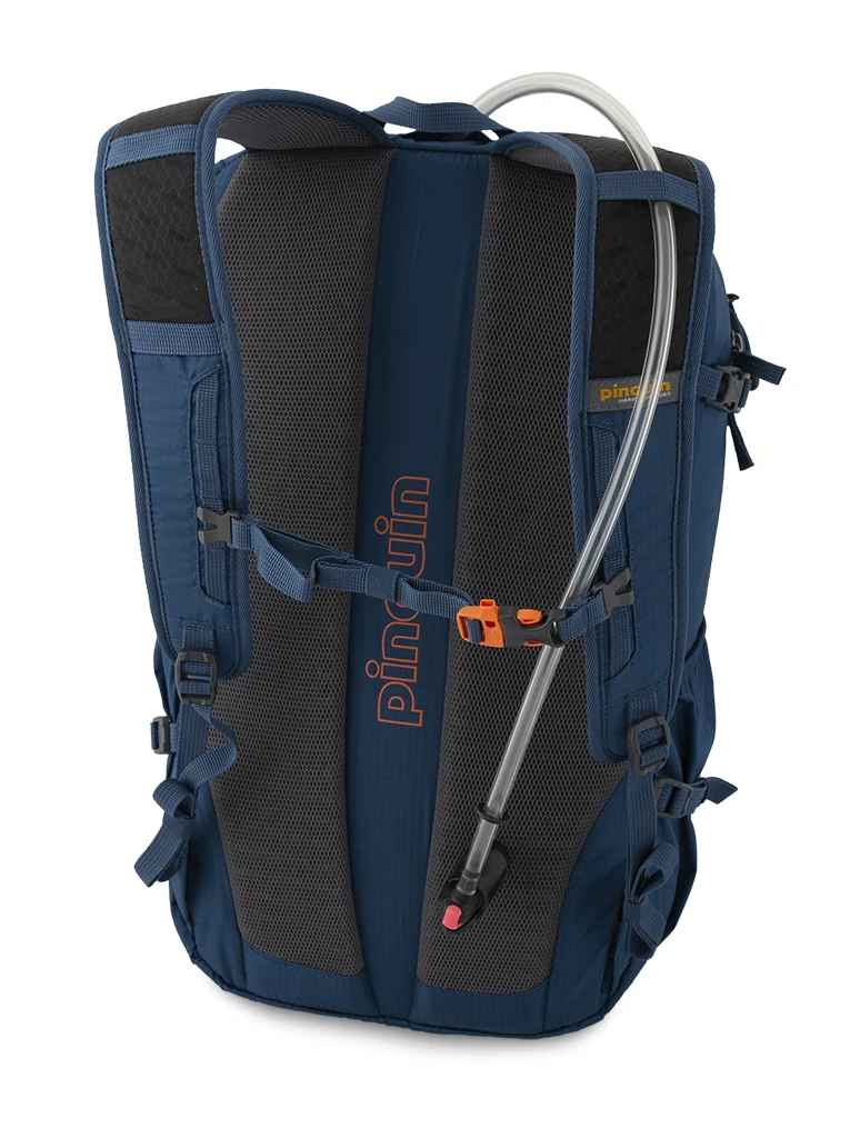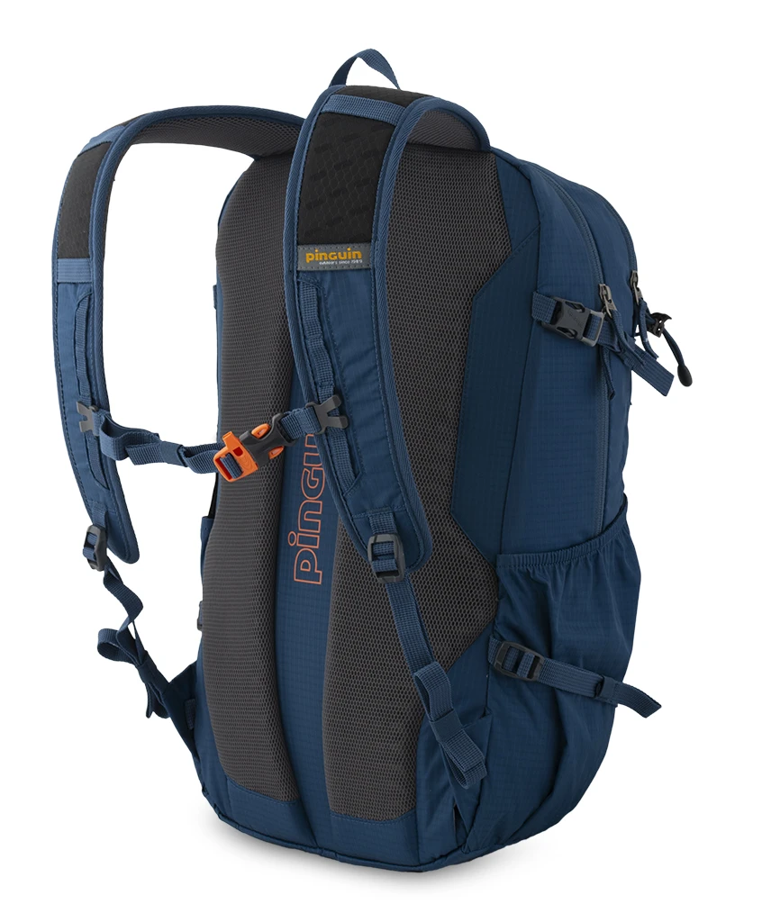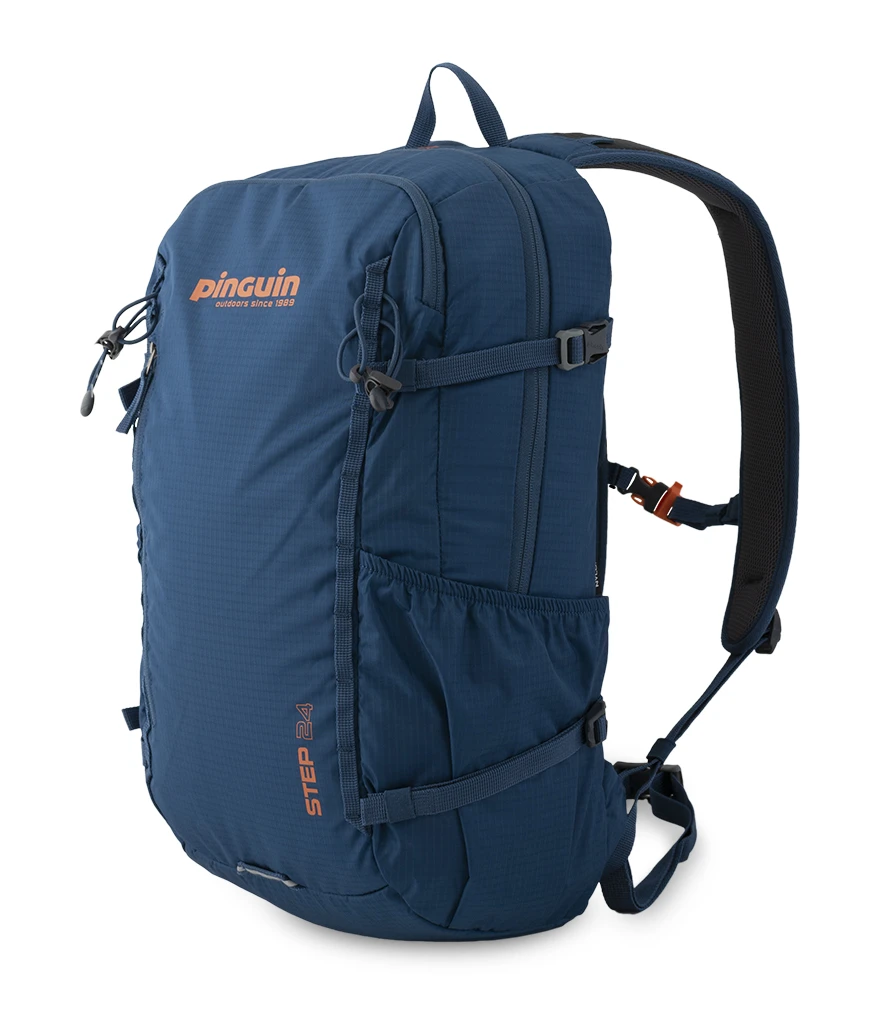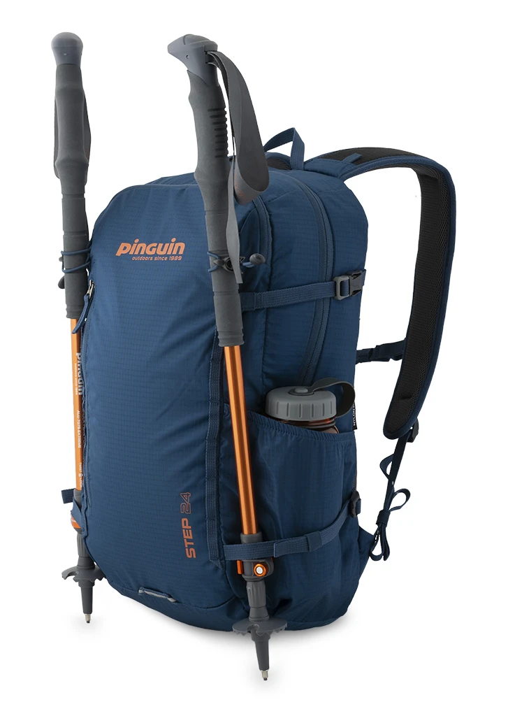 Outdoorový batoh Pinguin Step 24: jednokomorový batoh s pláštěnkou pro všestranné využití (např. pochůzky ve městě, vycházky, výlety, kroužky, tréninky, ale třeba i k cestám do školy). Má nastavitelné popruhy, polstrovanou kapsu na notebook, poutka na trekové hole, boční síťované kapsy na láhev.