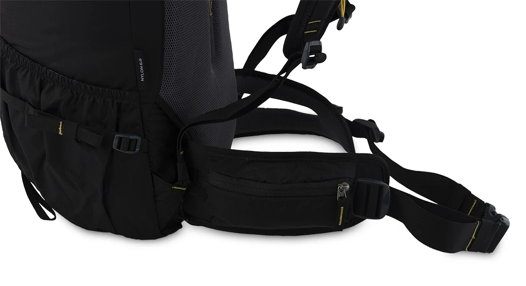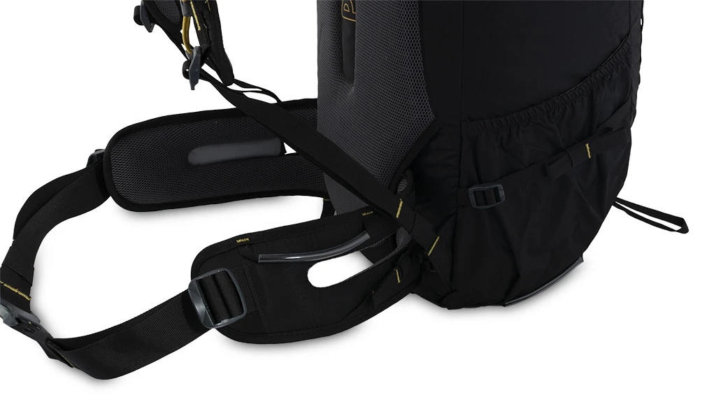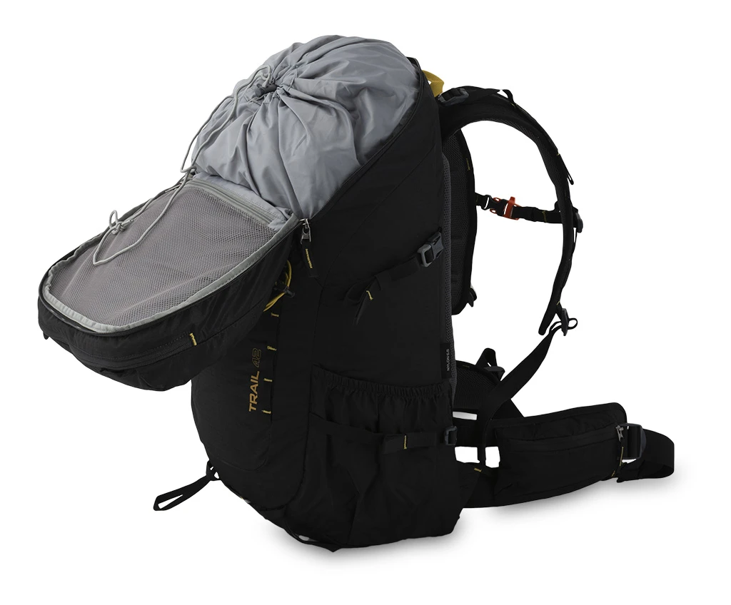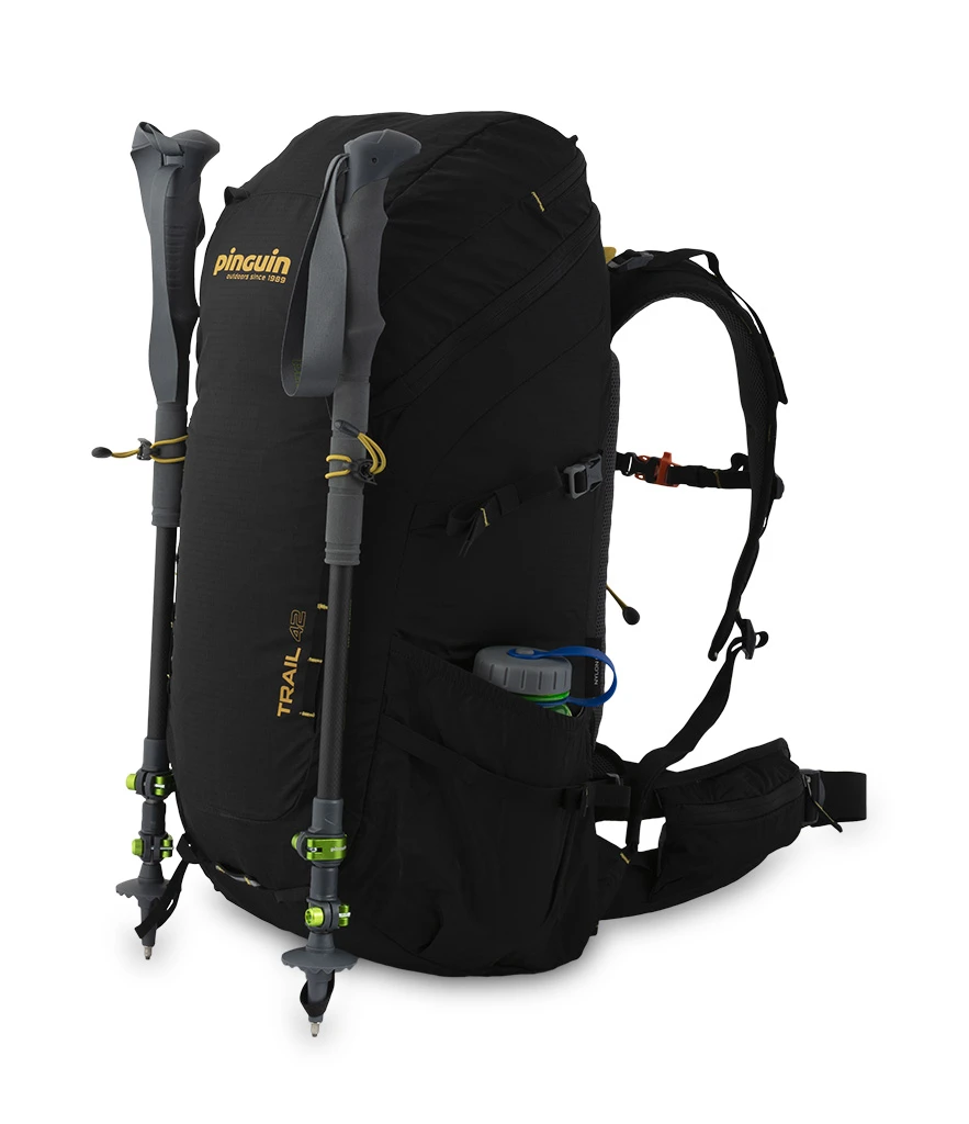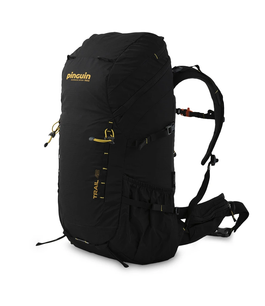 Pinguin Trail 42 má stavitelné ramenní popruhy se zesíleným polstrováním v ramenní části. Dvě boční síťovane kapsy na láhve. Dva boční kompresní popruhy. Batoh má odnímatelný vrchlík. Čelní zipová kapsa, strečové boční kapsy, poutka pro uchycení trekových holí, odnímatelná výztuha zad, reflexní poutko na blikačku v dolní části batohu.