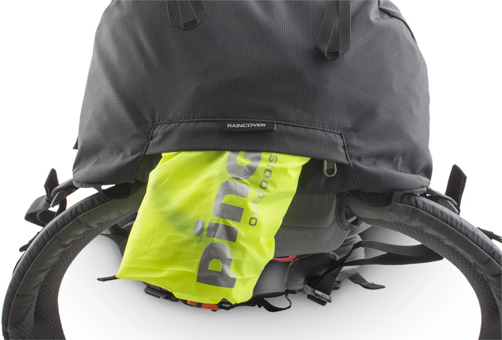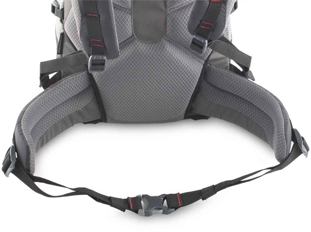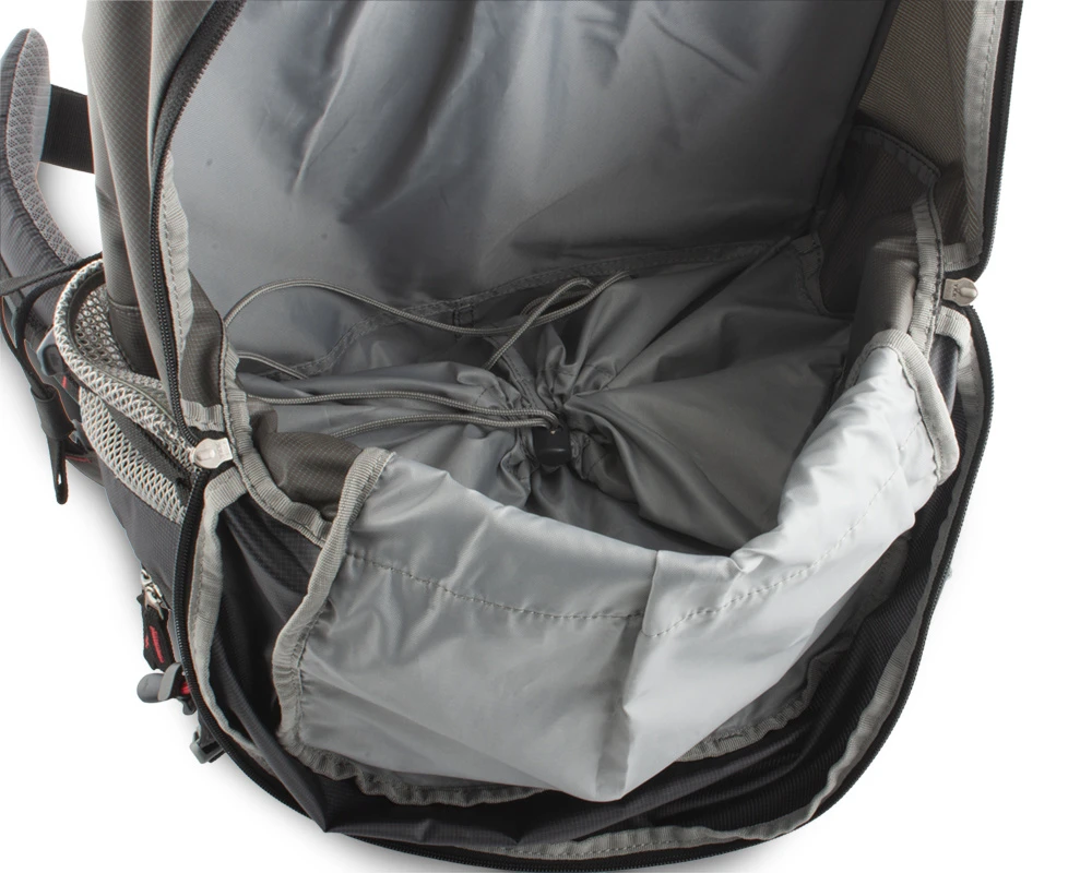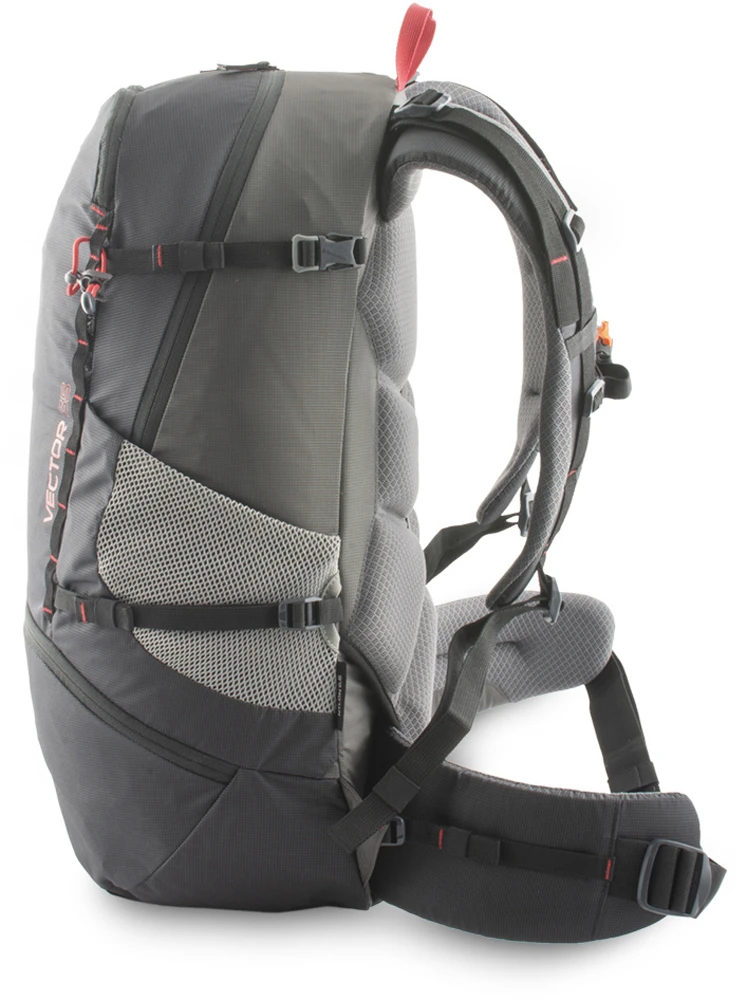 Záda jsou zkonstruována s ohledem na co nejlepší větrání při optimálním rozložení nákladu. Jedna tvarovaná duralová výztuha, jedna vnitřní a jedna vnější kapsa. Odnímatelná pruženka na čele batohu, boční strečové kapsy, poutka pro uchycení trekových holí.
