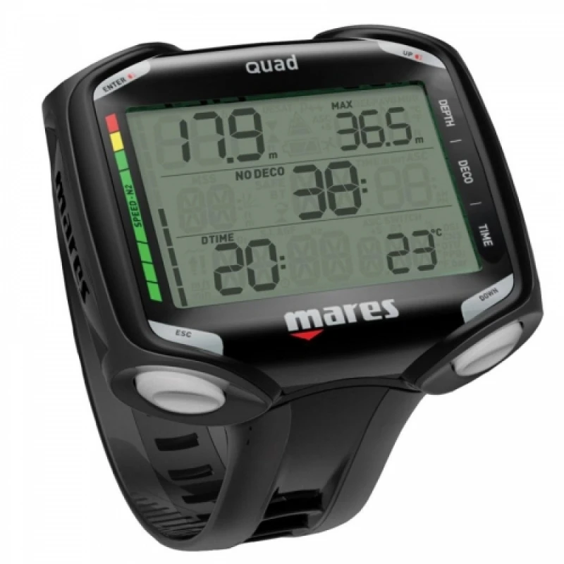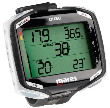 Mares Quad – je potápěčský počítač, který vyniká jednoduchostí ovládání a dobrou čitelností. 2 pole jdou individuálně nastavit pro doplňkové informace. Baterie slouží po 200–300 ponorů, jde vyměnit uživatelsky.