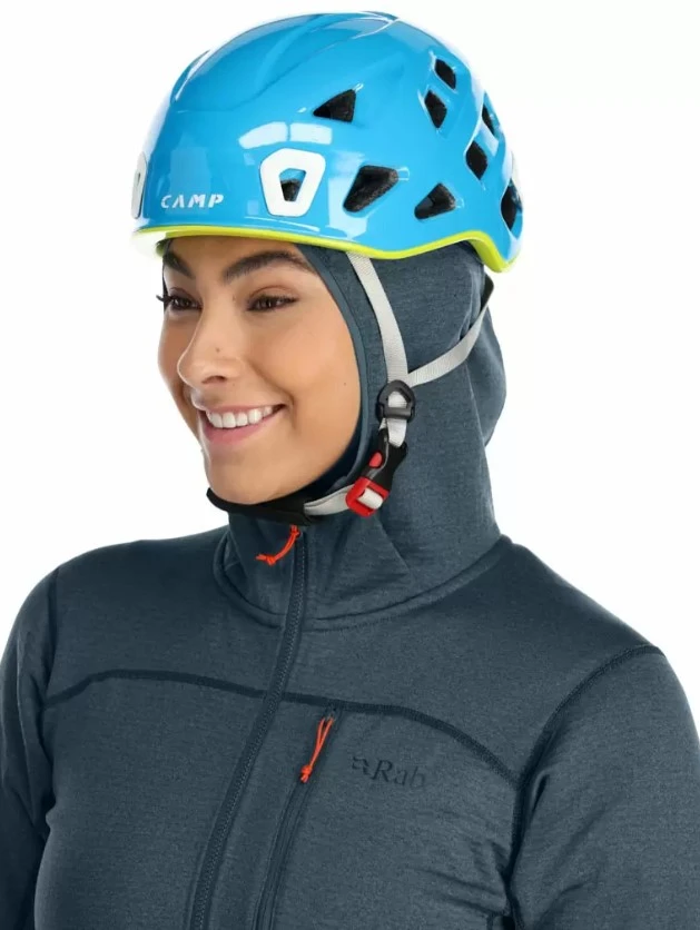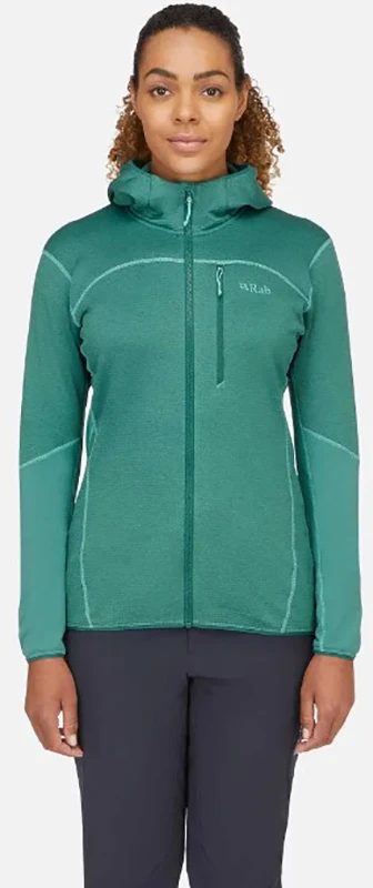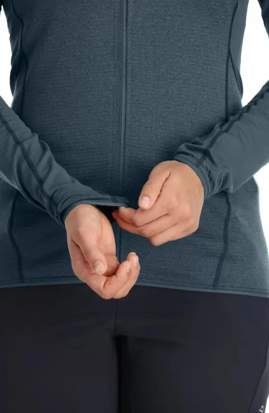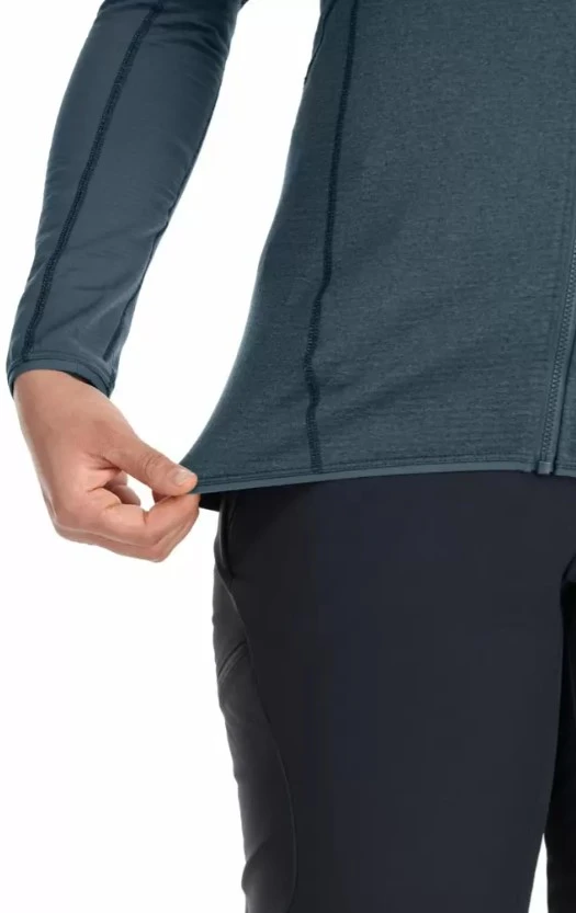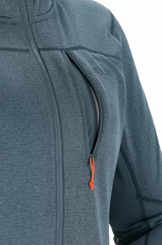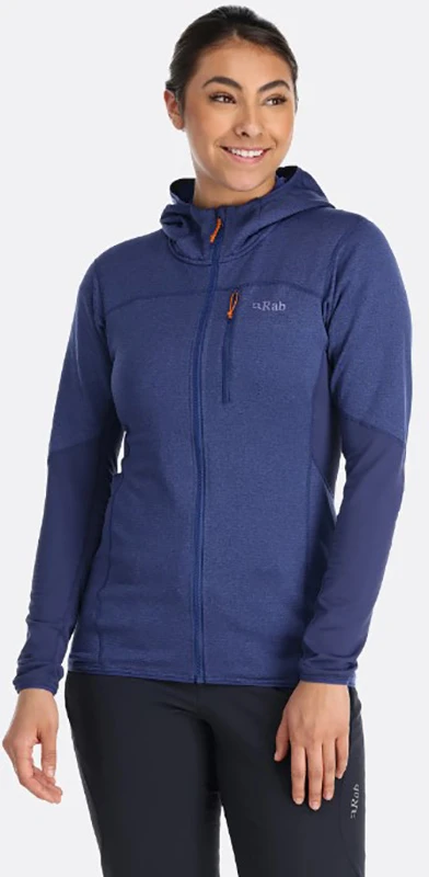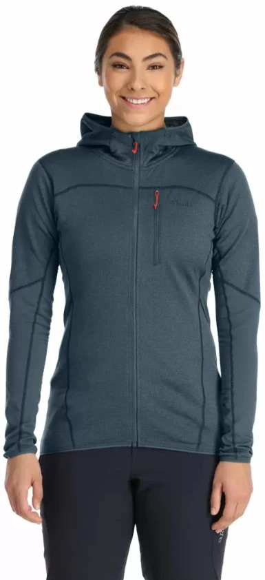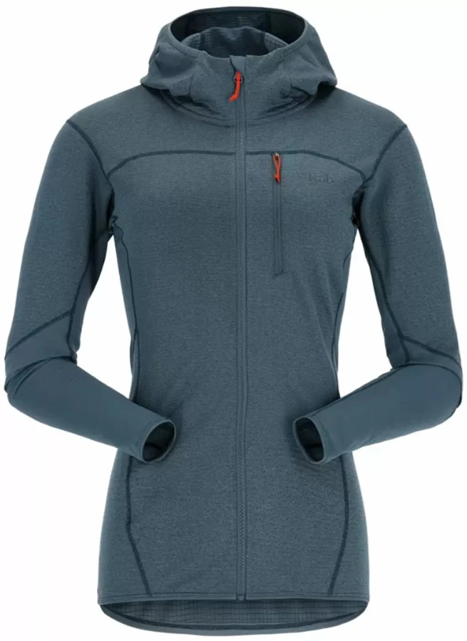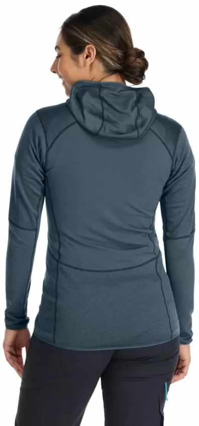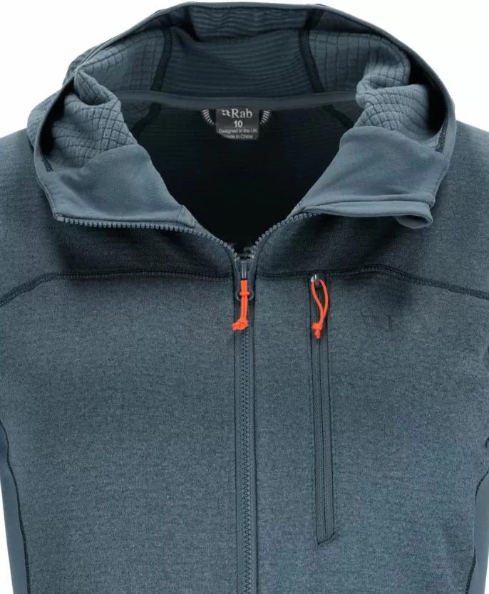 Rab Ascendor Hoody Womens: dámská fleecová mikina s kapucí vhodná na sporty v chladnějším počasí. Je vyrobena z recyklovaného materiálu, který je na mikině použit ve dvou gramážích. Těžší a teplejší je použit tam, kde je potřeba zahřát (torso, boky, ramena, spodní část zad a horní část nadloktí). Má mřížkovanou strukturu. Lehčí je na místech, kde se více potíme (předloktí, horní část zad a spodní část nadloktí) a je potřeba odvést vlhkost od těla.