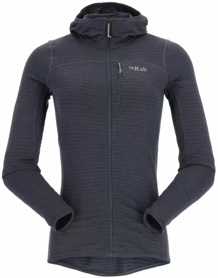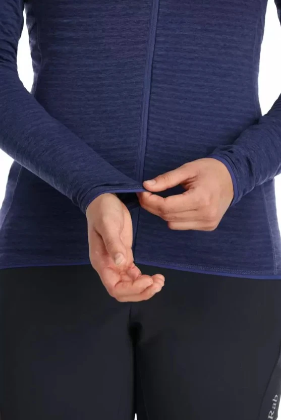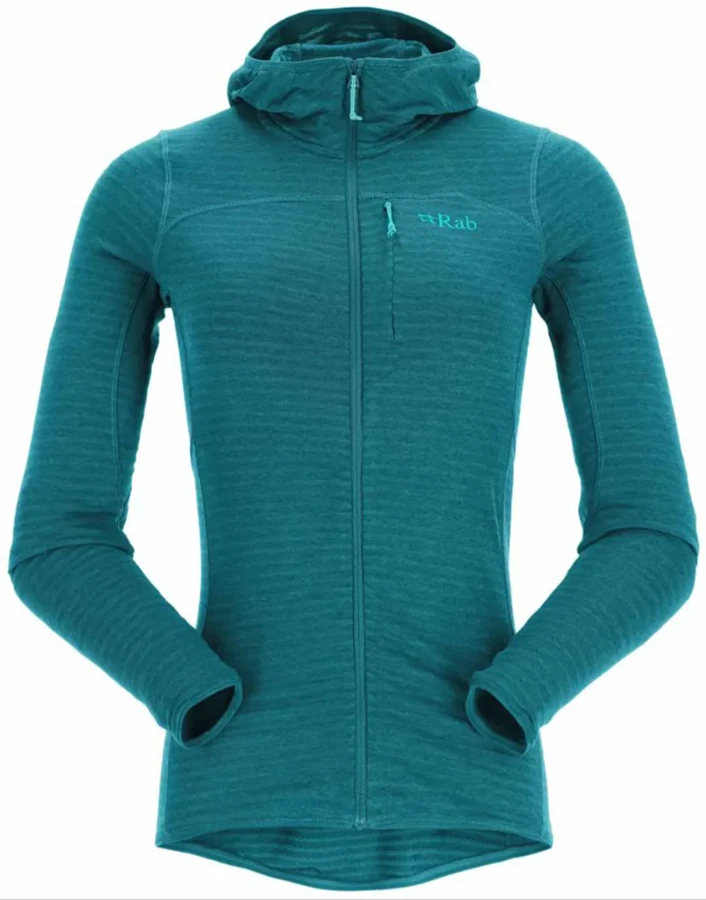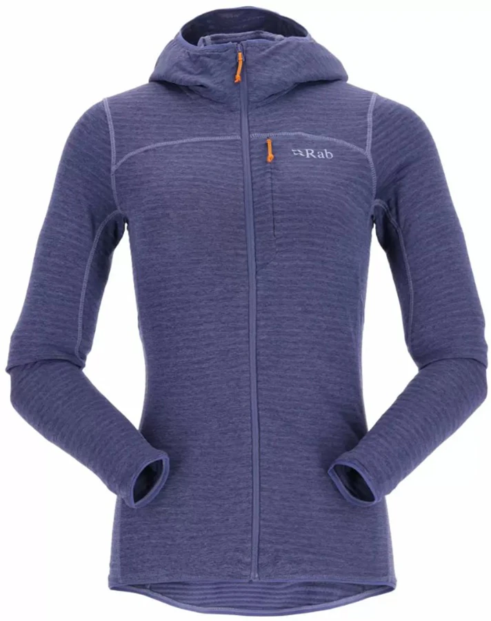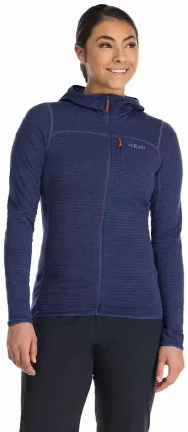 Rab Ascendor Light Hoody Womens: ultralehká dámská mikina s kapucí vhodná na sporty v chladnějším počasí. Váží pouze 194 g. Je vyrobena z recyklované strečové tkaniny Thermic™ S, která usnadňuje usychání a zlepšuje prodyšnost. Tento materiál se tak skvěle hodí pro aerobní aktivity v chladnějších podmínkách – zahřeje a díky skvělému odvodu tělesné vlhkosti nás udrží v suchu i při fyzicky náročnějších aktivitách.