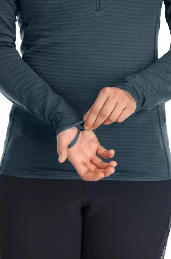 Rab Ascendor Light Pull-On Womens: lehká dámská mikina vhodná na sporty v chladnějším počasí. Je vyrobena z recyklované strečové tkaniny Thermic S, která usnadňuje usychání a zlepšuje prodyšnost. Tento materiál se tak skvěle hodí pro aerobní aktivity v chladnějších podmínkách – zahřeje a díky skvělému odvodu tělesné vlhkosti nás udrží v suchu i při fyzicky náročnějších aktivitách.