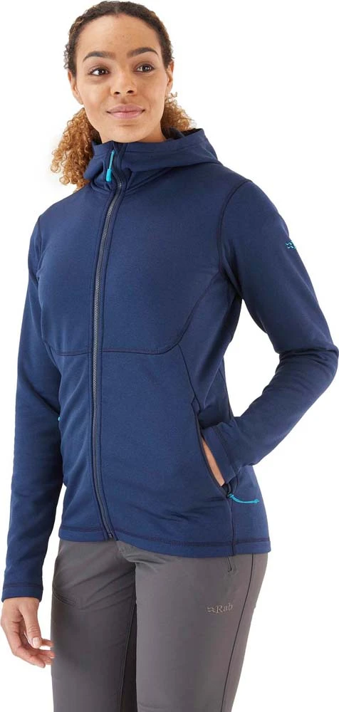 Rab Geon Hoody Womens je vyrobený z fleecového materiálu Thermic, má vaflovou konstrukci. Pletenina má mezi chlupy kanálky, které udržují teplý vzduch u těla, ale usnadňují pronikání vodních par od těla a usnadňují schnutí flísu.