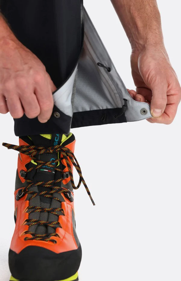 Využívají třívrstvou membránu Pertex Shield s vodním sloupcem 20000 mm a velmi dobrou prodyšností. Kolena jsou před tvarovaná. Nohavice mají stahování. Je v nich poutko pro připevnění lanka pod botou.