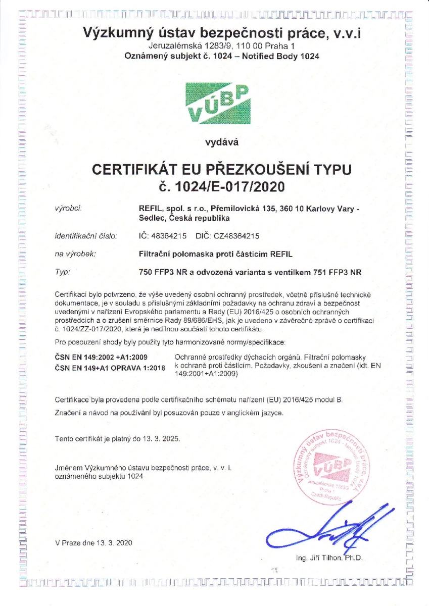 Certifikace: EN 149+A1:2009, CE 1024