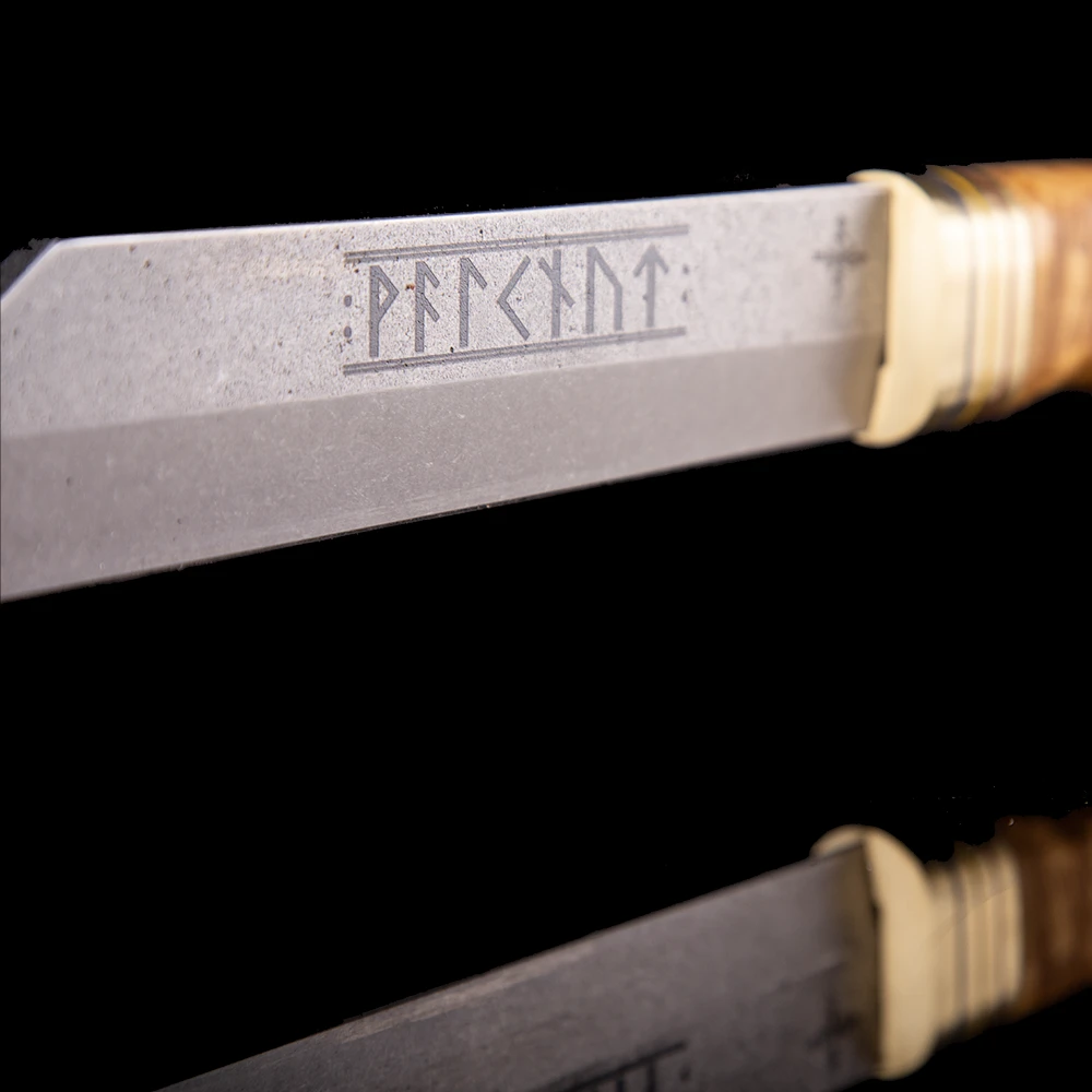 Čepel je z oceli Sleipner. Nůž má výbrus Seax.
